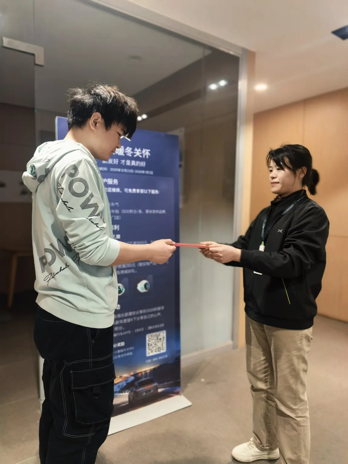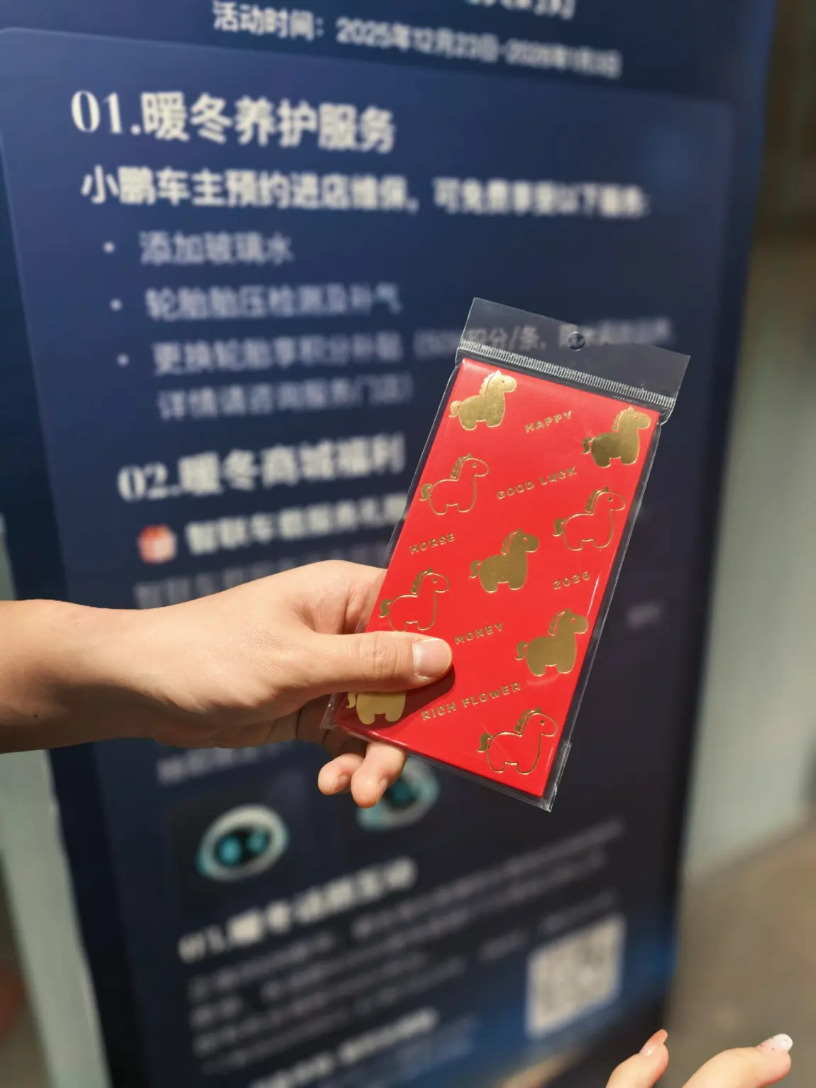 来到小鹏汽车兴义桔山店的大门,“暖冬同行”的活动气息扑面而来。笑容满面的工作人员递上喜庆的“马年红包”进店礼和一只可爱的“小马抱枕”伴手礼,寓意着马到成功的祝福。稍作休息,小姐姐已为我的爱车免费添加了冬季玻璃水,并快速完成了胎压监测与补气。怀抱温暖,手握吉祥,车辆也精神焕发。从小礼物到大关怀,每一步都心意满满。#小鹏汽车 #小鹏智能服务 #小鹏暖冬关怀