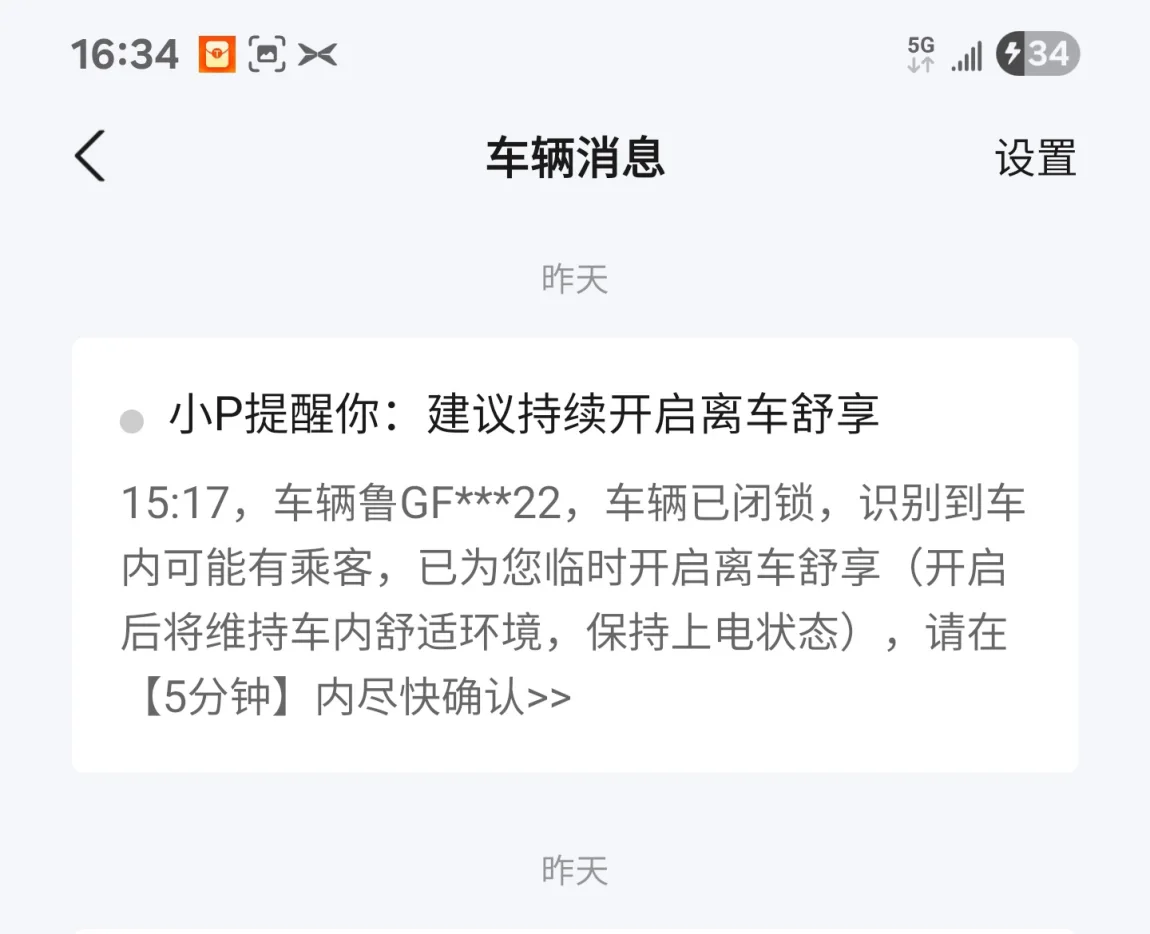 一个不断创新,不断给你惊喜的鹏友。目前更新的的系统车位到车位还未体验。但是一些舒享功能还是很实用的。比如这个离车舒享几解决了驾驶员离车不下电,车内还可自由出入。同时车外却可以上锁。而且长时间开启还有提醒真的很周到想的很全面。