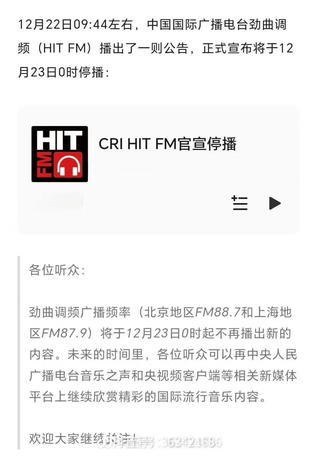 劲曲调频广播频率(北京地区FM88.7和上海地区FM87.9)将于12月23日0时起不再播出新的内容。