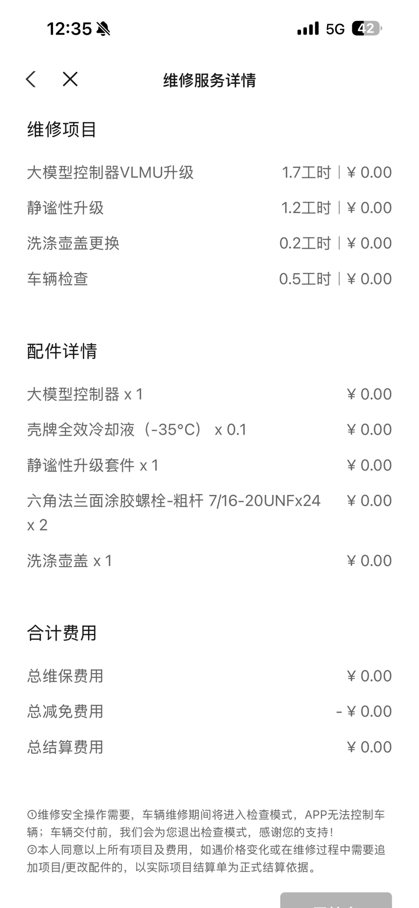 1. 免费的“整车焕新”:这次服务远不止检查。最惊喜的是免费升级了“静谧性套件”,并对核心的大模型控制器(VLMU)进行了升级。开出车间那一刻,仿佛开上了一台更安静、更“聪明”的新车。结算单上清晰列明,所有项目总费用为0元,这份诚意满分。