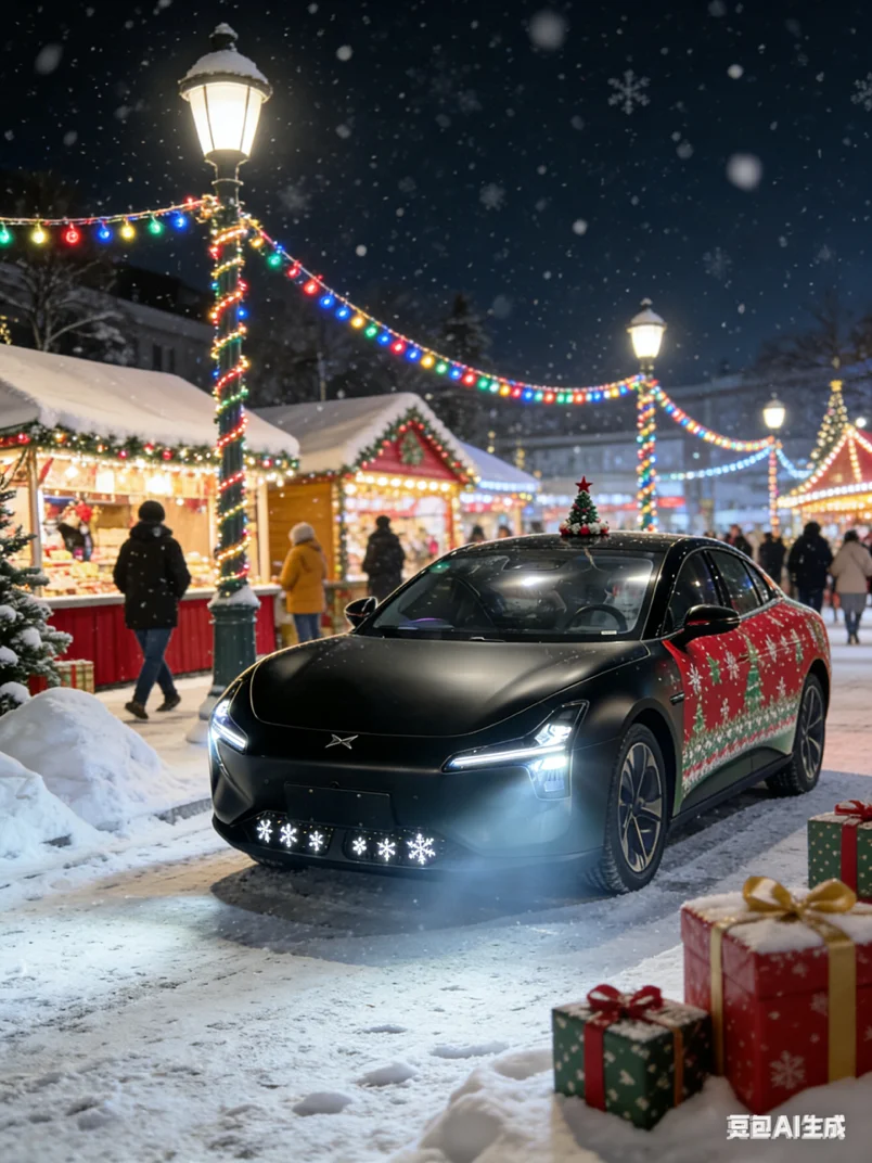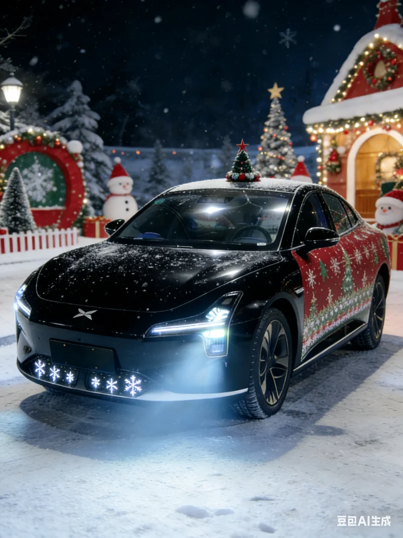 #我的圣诞魔力座驾# 圣诞氛围拉满的街头,我的小鹏MONA化身专属魔法座驾。哑光黑车身质感拉满,红绿色圣诞花纹渐变流淌于车身侧面,前脸格栅的迷你雪花灯效轻轻闪烁,车顶的小装饰俏皮又可爱。它以流畅的车型线条穿梭在节日光影里,每一次启停都带着圣诞的浪漫,载着我奔赴一场又一场温馨的冬日约会。