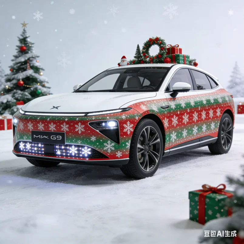 圣诞季怎么能少了专属仪式感!给我的小鹏换上了 AI 生成的圣诞涂装,红绿色彩碰撞超吸睛,车身上的雪花、圣诞树图案栩栩如生,行驶在路上回头率满满~