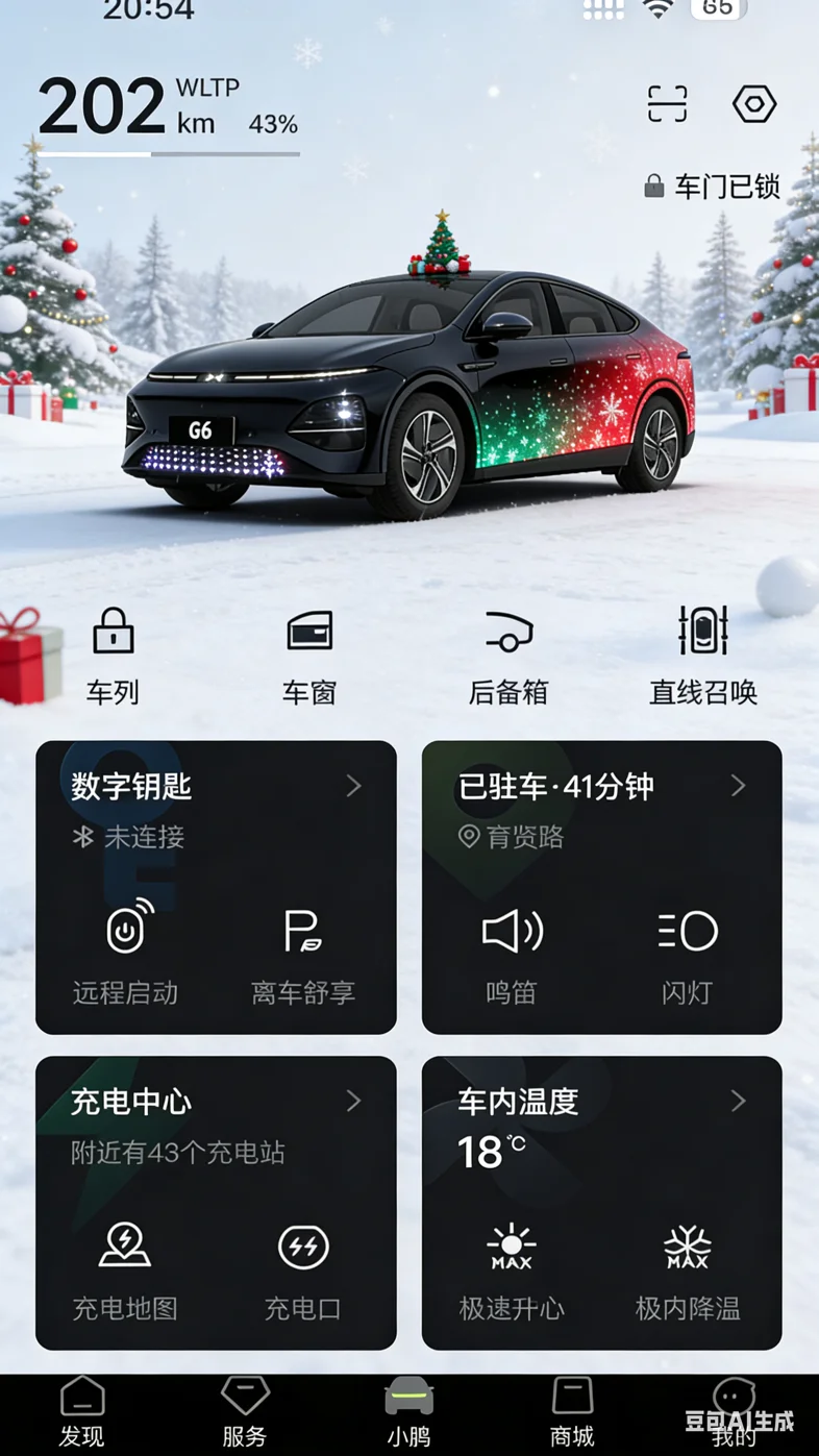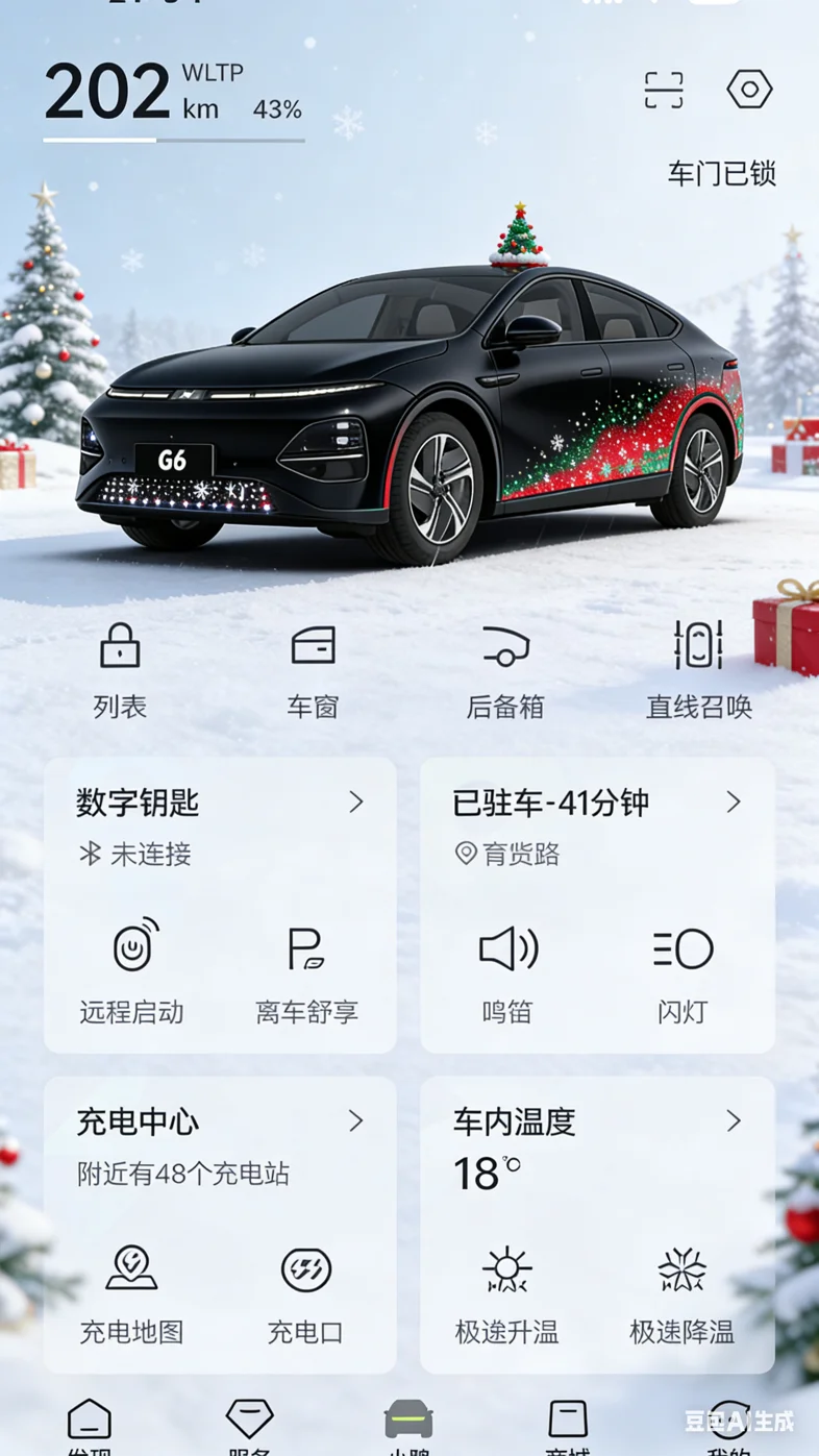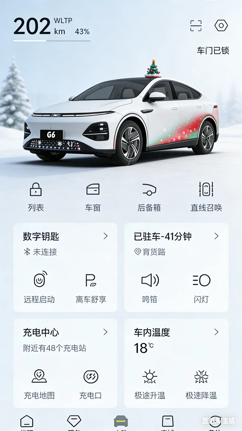 车身侧红绿色圣诞花纹渐变幻彩,前脸格栅迷你雪花灯效轻闪,车顶小装饰精准戳中节日萌点。雨夜停在路旁的它,把普通泊车时刻裹成了暖融融的圣诞小确幸。