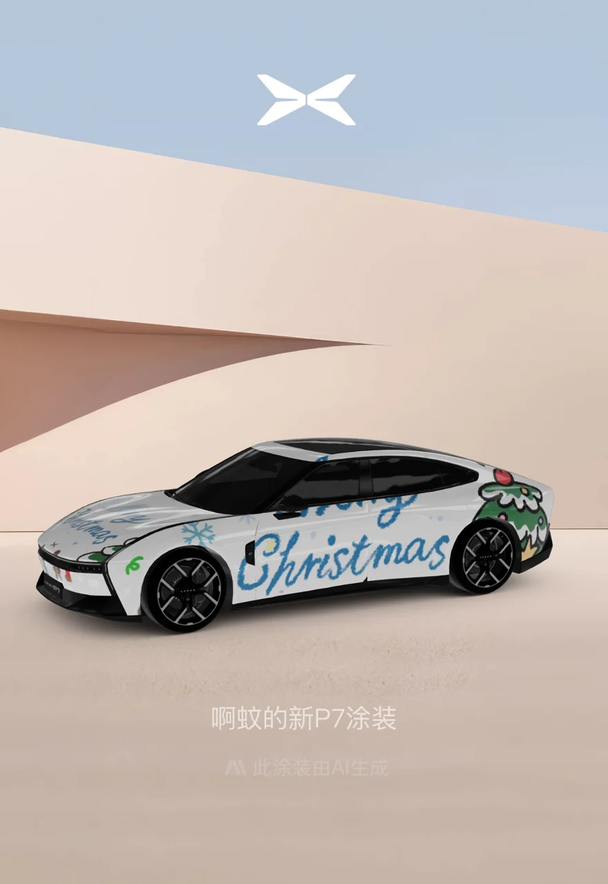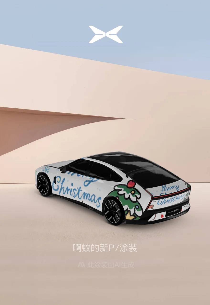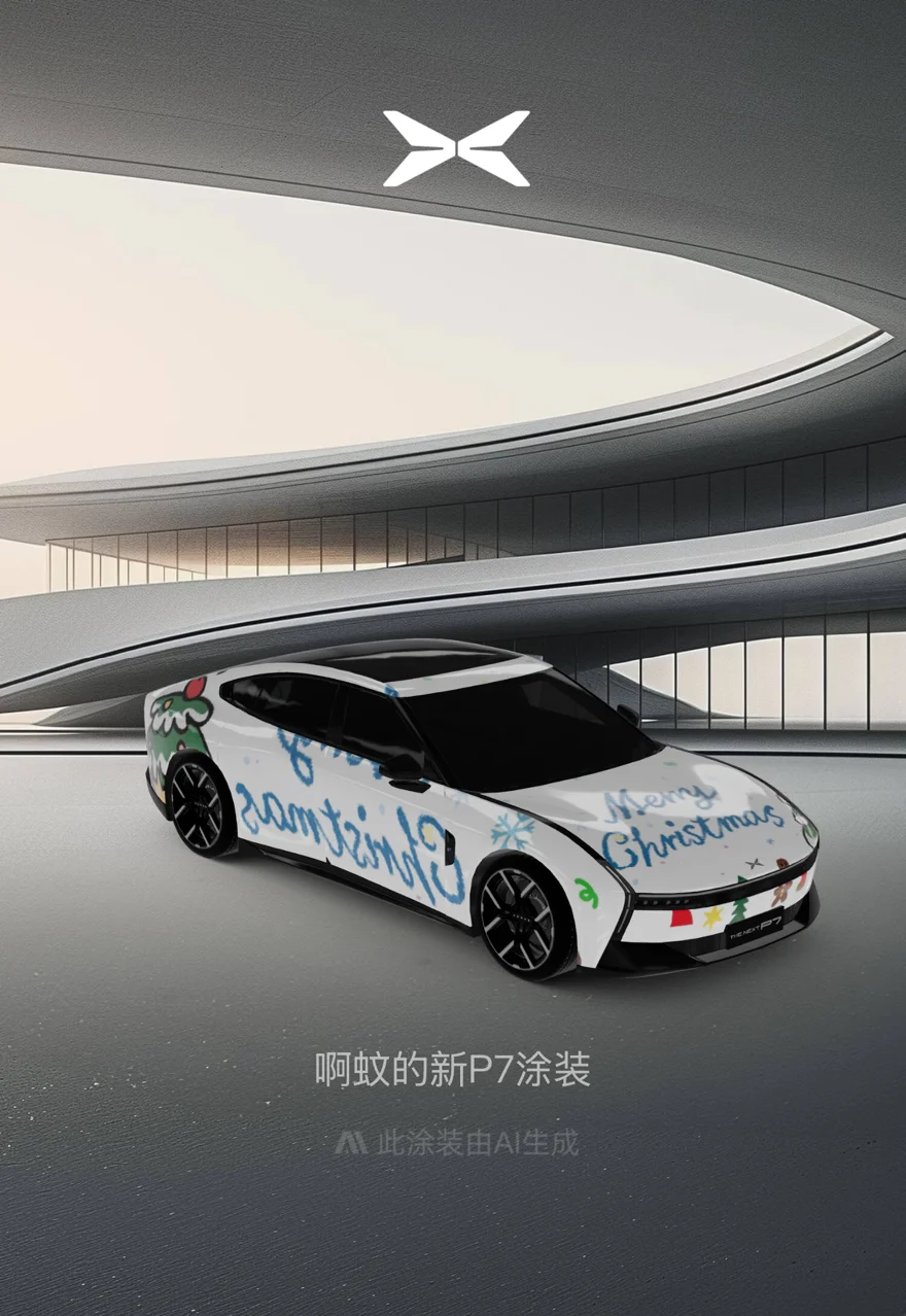#我的圣诞魔力座驾# 圣诞涂装脑洞大开,我的小鹏化身冬日童话主角用AI给我的小鹏做圣诞涂装也太有成就感了!侧面晕染开红绿色的圣诞花纹,写实的画风把车型线条和涂装质感完美还原。看着屏幕里的成品,感觉我的小鹏一下子从日常座驾变成了冬日童话里的主角,每一处圣诞元素都戳中了我的心巴。这份专属的圣诞仪式感,也太惊喜啦~