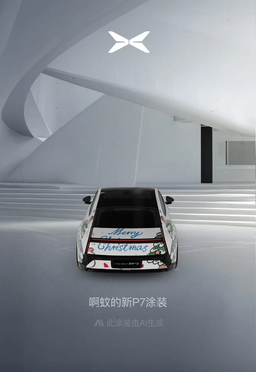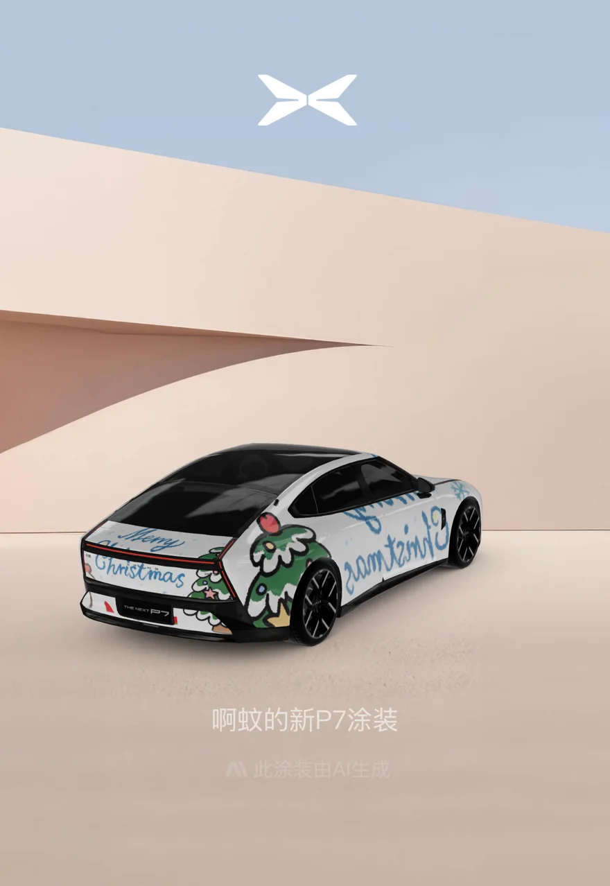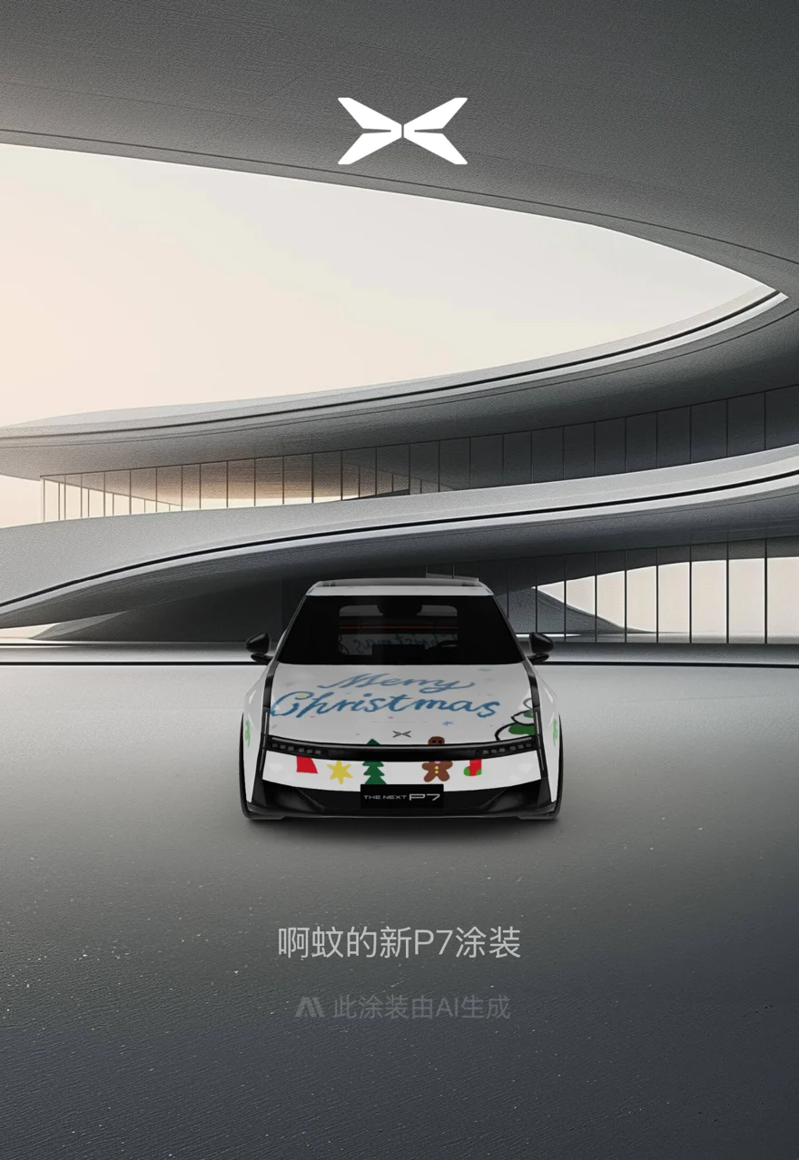 #我的圣诞魔力座驾# 圣诞涂装脑洞大开,我的小鹏化身冬日童话主角用AI给我的小鹏做圣诞涂装也太有成就感了!侧面晕染开红绿色的圣诞花纹,写实的画风把车型线条和涂装质感完美还原。看着屏幕里的成品,感觉我的小鹏一下子从日常座驾变成了冬日童话里的主角,每一处圣诞元素都戳中了我的心巴。这份专属的圣诞仪式感,也太惊喜啦~