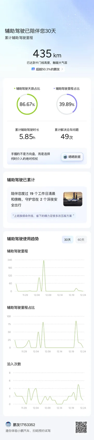 30天的相伴,辅助驾驶陪我跑了435km,触碰到卡门线高度的浪漫,86.67%的天数里都有它的守护,5.85小时的辅助时长、49次泊车难题的化解,让通勤清晨少了慌乱,深夜出行多了安心,这科技加持的驾驶体验,真的太戳心~