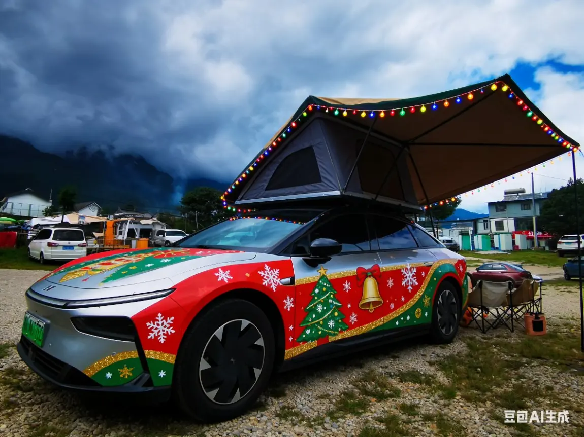 银灰色的车身在藏地的云影里泛着冷光,却被圣诞的暖意悄悄裹了层温柔。车顶的帐篷支棱着像圣诞树下撑开的礼物袋,车轮碾过的碎石路,是写给山海的圣诞诗行。