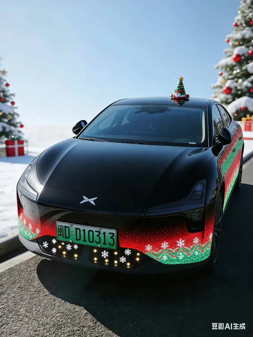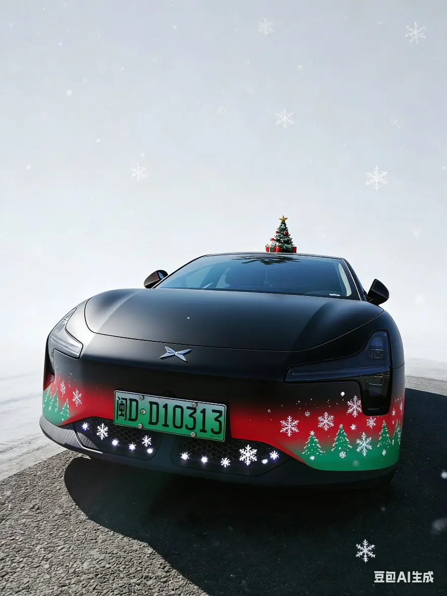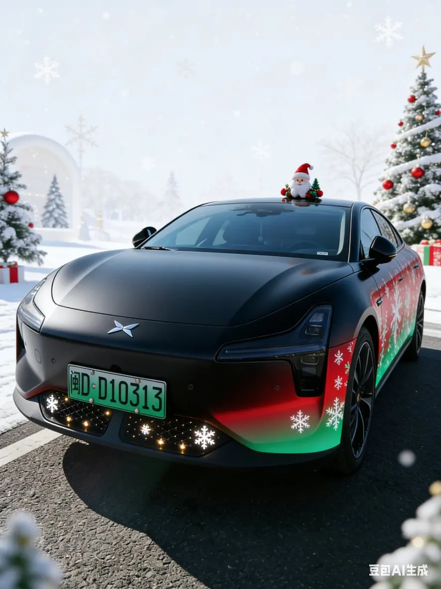 #我的圣诞魔力座驾# 哑光黑的小鹏MONA M03车身线条流畅,侧面红绿色圣诞花纹渐变自然,松枝与铃铛纹理顺着车身曲面延展。前脸格栅嵌着迷你雪花灯效,冷白光芒点缀出圣诞氛围;车顶立着小巧圣诞树与麋鹿装饰,背景是覆薄雪的欧式街道,这车太有质感了,完美的融合了圣诞的主题。