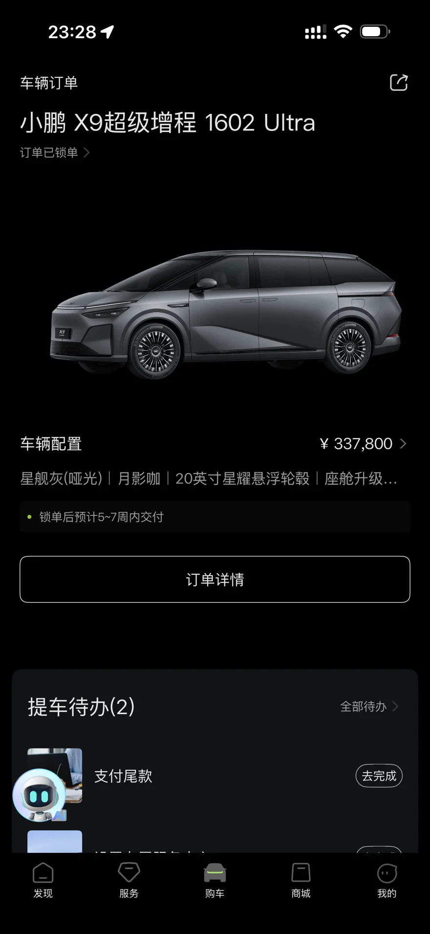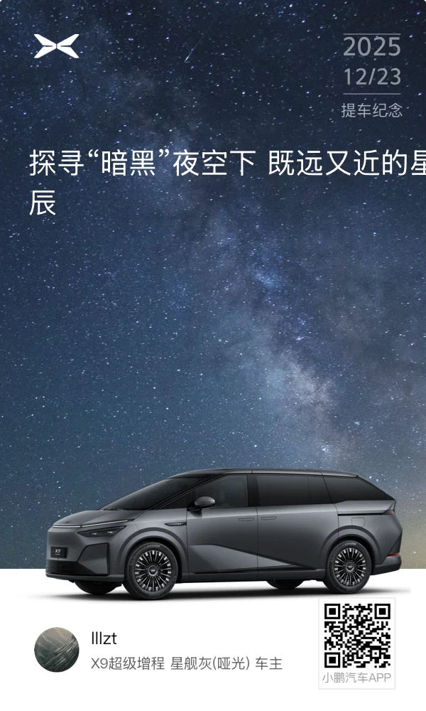 发布会开完没有第一时间下订,还是等到第一个周末去试驾,一共试驾了两回,一次到店一次上门。接着就在11月25日锁单,理由也非常简单。之前已经试驾过纯电版,当时觉得底盘还是非常松散,MPV纯电还是觉得有所顾虑,直到迎来了超级增程版,试驾过后发现底盘素质明显提升,超长续航,无感增程,那就直接开冲吧。等了1个月的时间,比预计时间提前,不得不为小鹏点个赞。星舰灰这个颜色真的太棒了。以后我们一起做朋友吧。#我的提车作业#
