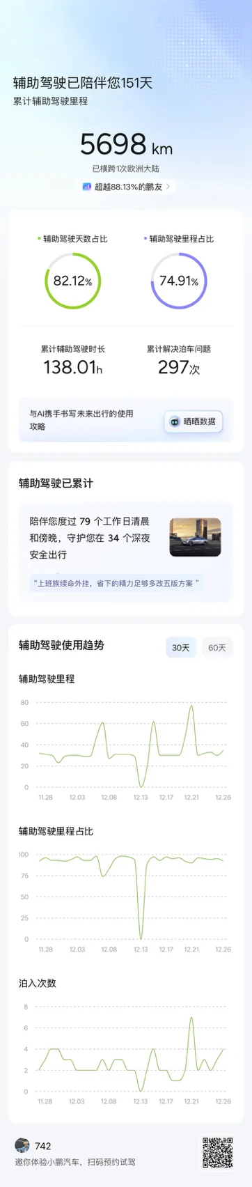 开小鹏智驾已经151天啦,累计跑了5698km,11月辅助驾驶里程更是干到1657km,里程占比93.92%直接拉满!早高峰通勤全靠它解放双手,还点亮了6座城市的智驾足迹,谁用谁香!✨#小鹏汽车 #小鹏辅助驾驶