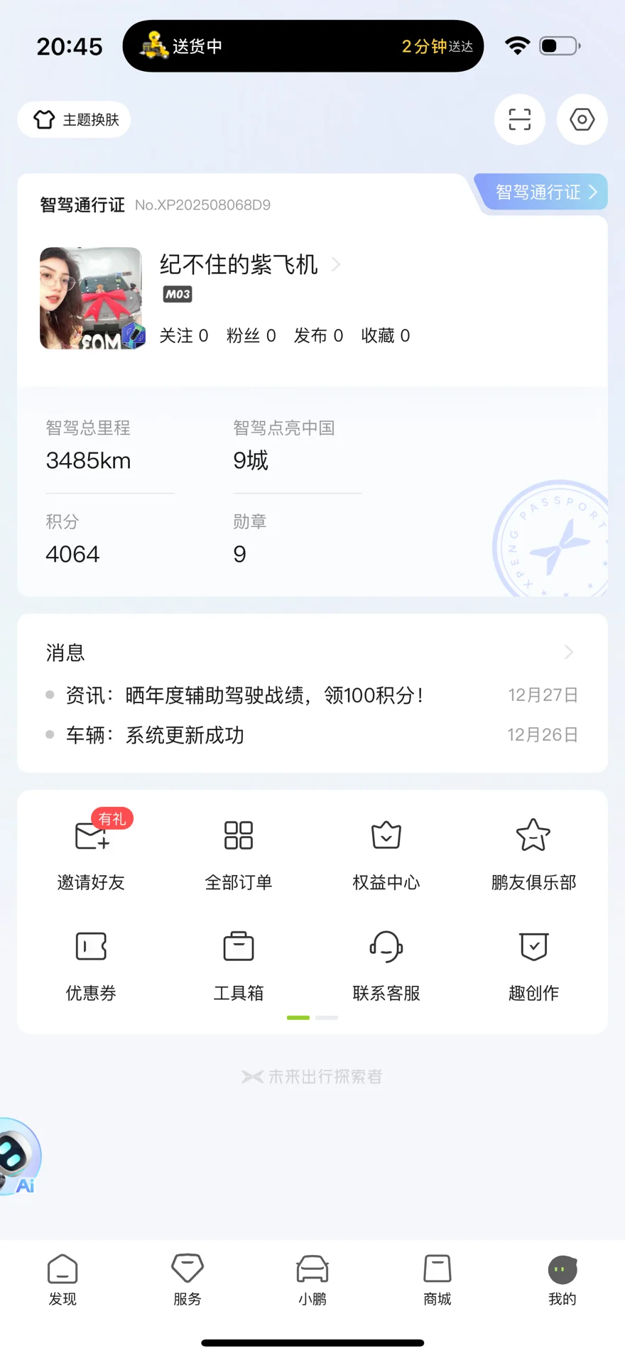 提车这段时间开了6930km,其中3485km都是靠智驾跑的,直接占了总里程的一半还多!连小鹏APP都显示智驾点亮了9座城市,攒了4064积分、解锁9枚勋章,这战绩我是真的服👍