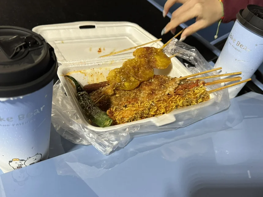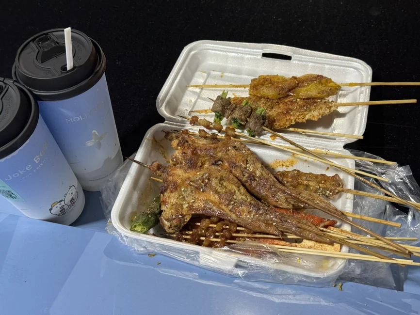 很凑巧的,老妹买了和心爱车车同色系的奶茶。大晚上到小鹏自营电站充电,还是在广东最冷的这一天,自然得搭配美美夜宵度过美妙充好电时刻。意外开发了尾翼“桌板”,共享美食,太美妙了