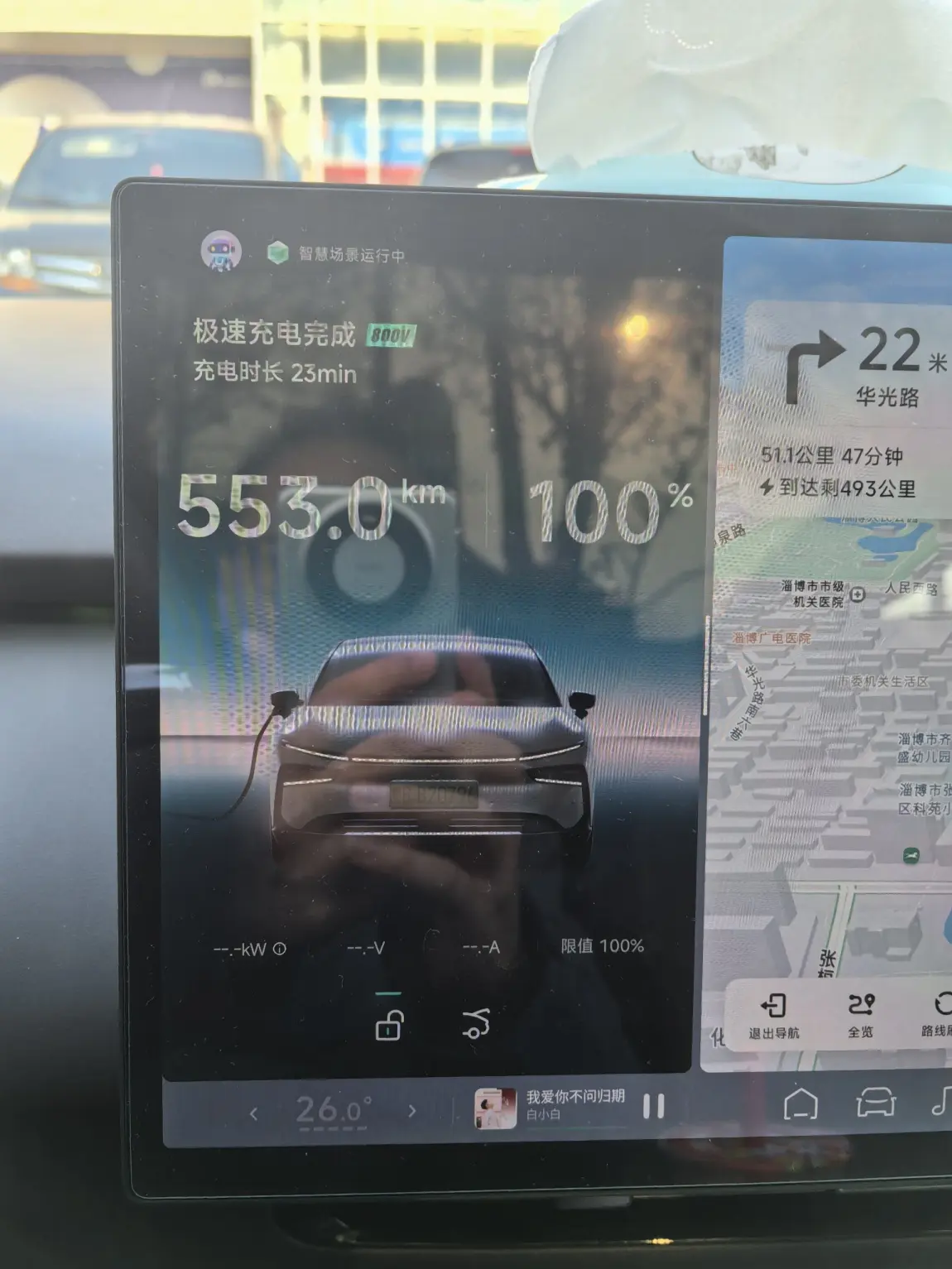 23分钟,从几乎见底到553km满电出发,比喝完一杯百香果饮料的时间还短。☕️