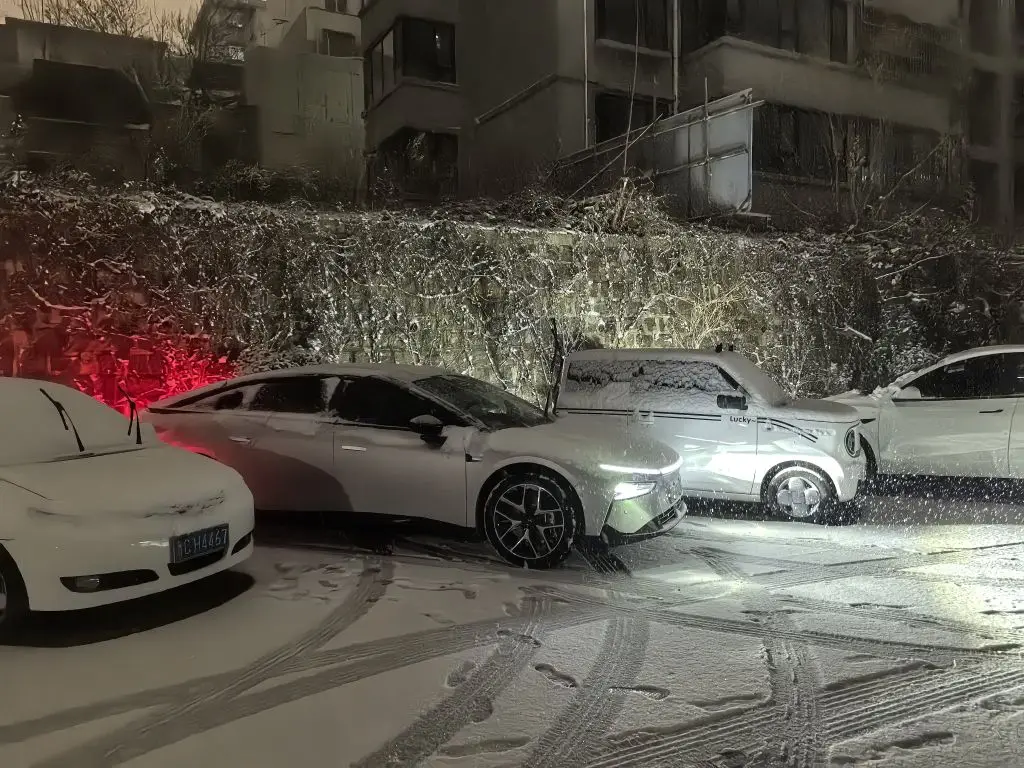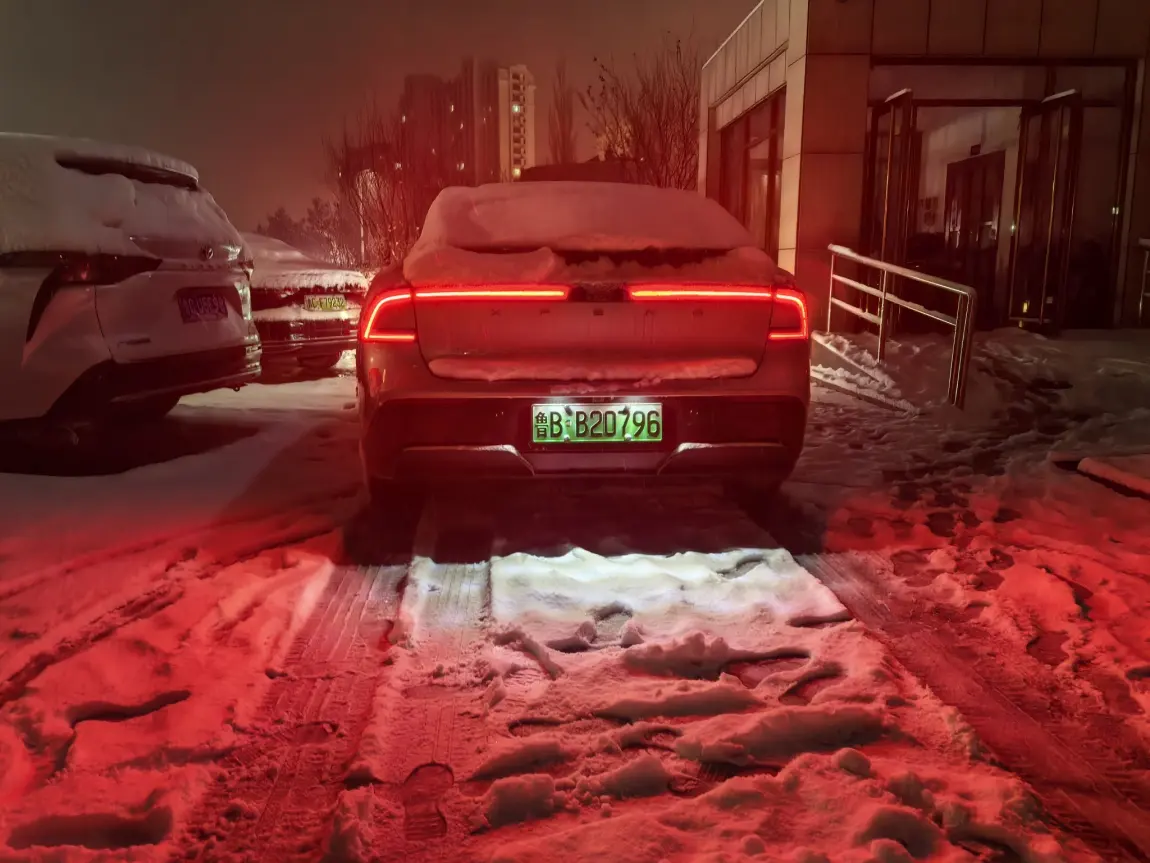 雪静静落着,覆在P7+流畅的车身上,像给它披了一层松软的绒毯。夜色渐深,贯穿式尾灯亮起一抹暖融融的红,映着飘雪,也映着楼上家里透出的光❄️🔴。