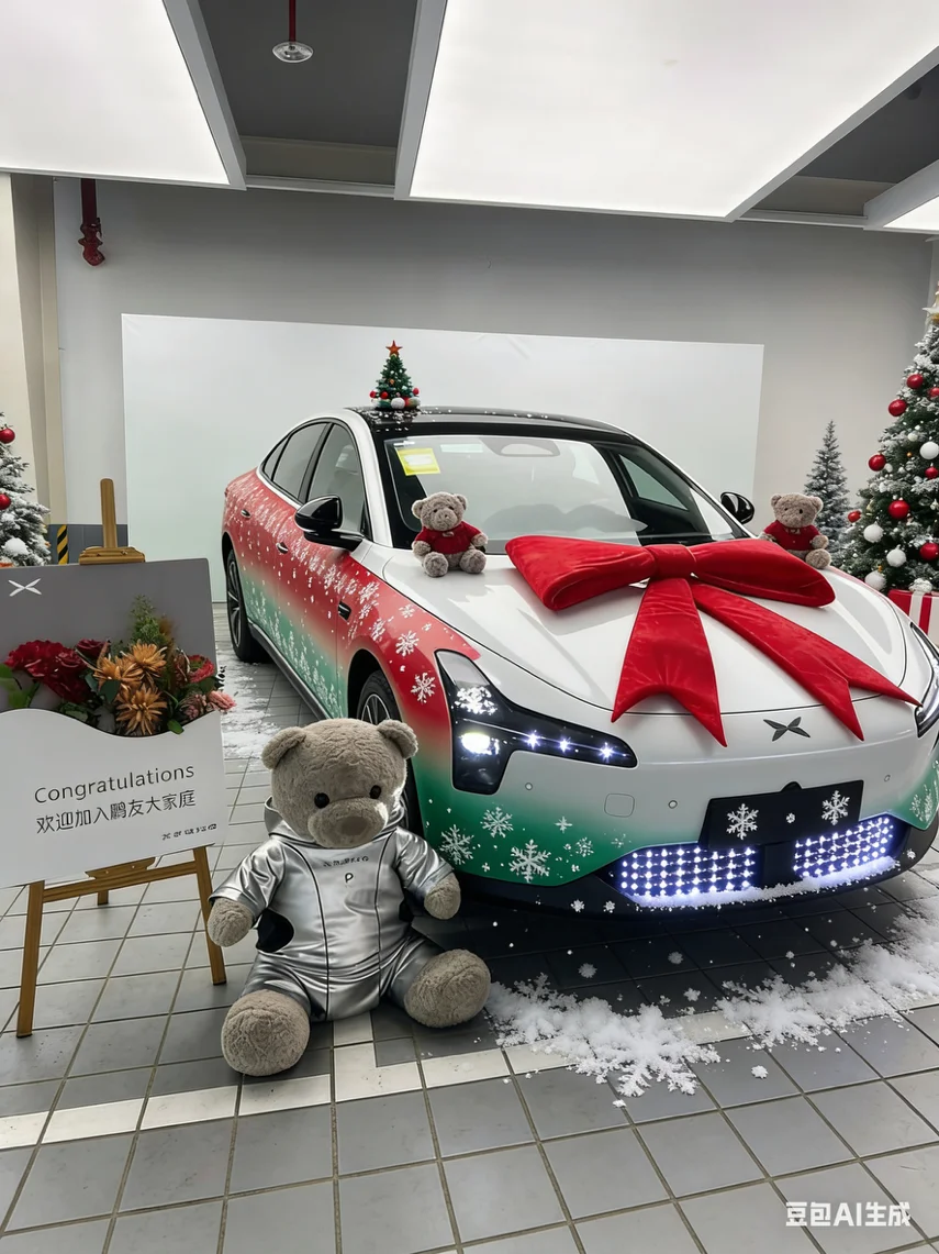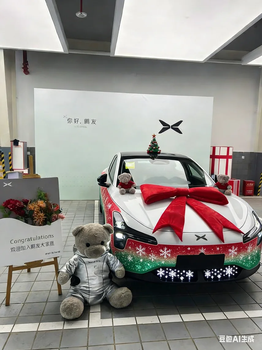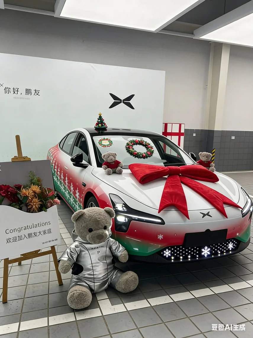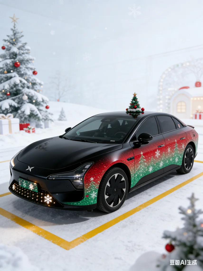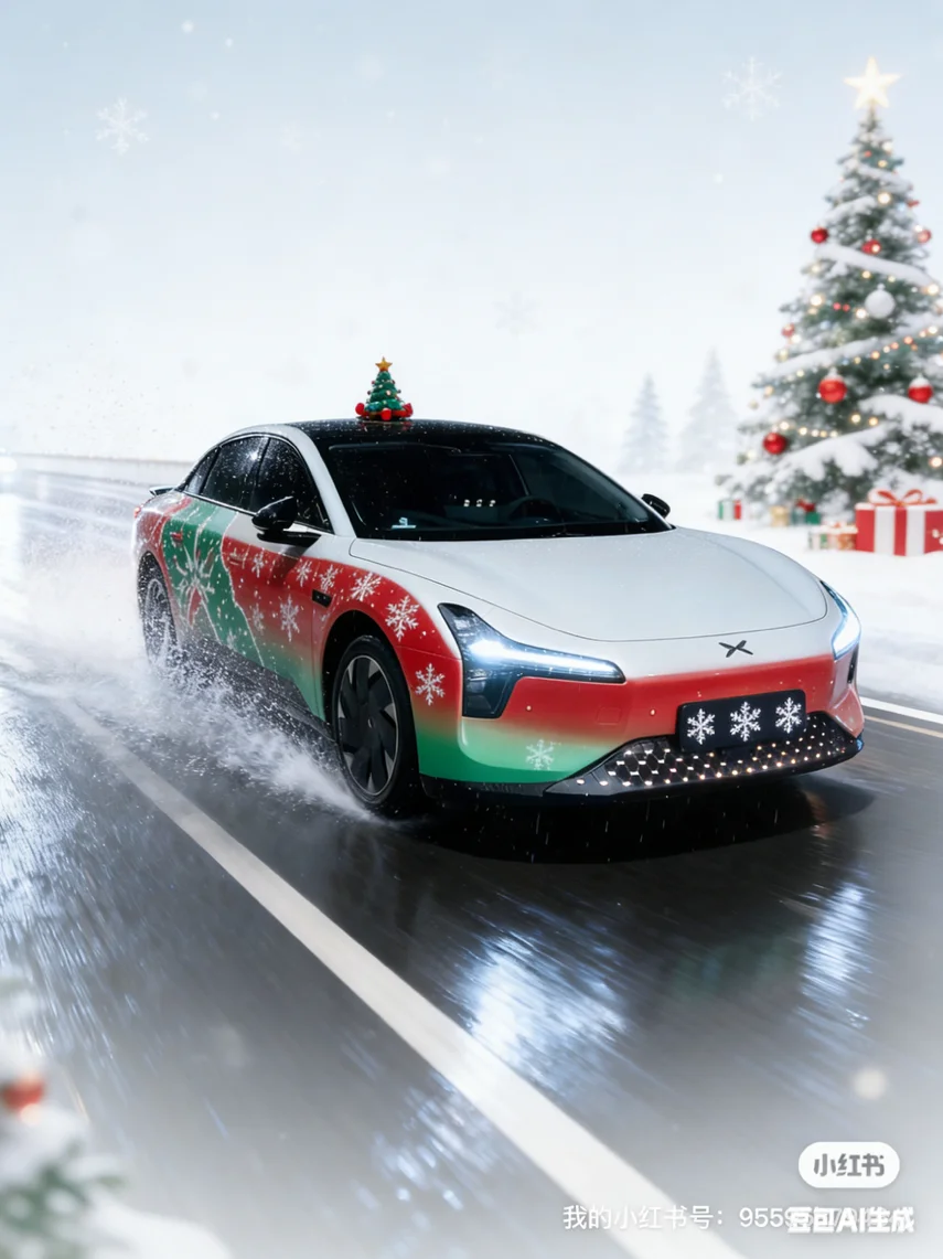 #我的圣诞魔力座驾# 晒出我的爱车圣诞装,圣诞节特别的把我的小鹏MONA M03进行了AI创作,这个颜色是真的超好看,搭配上了圣诞的装饰,很有圣诞节的气氛(。・ω・)ノ🔔,大灯都亮堂得很,前面的防虫网都有光。