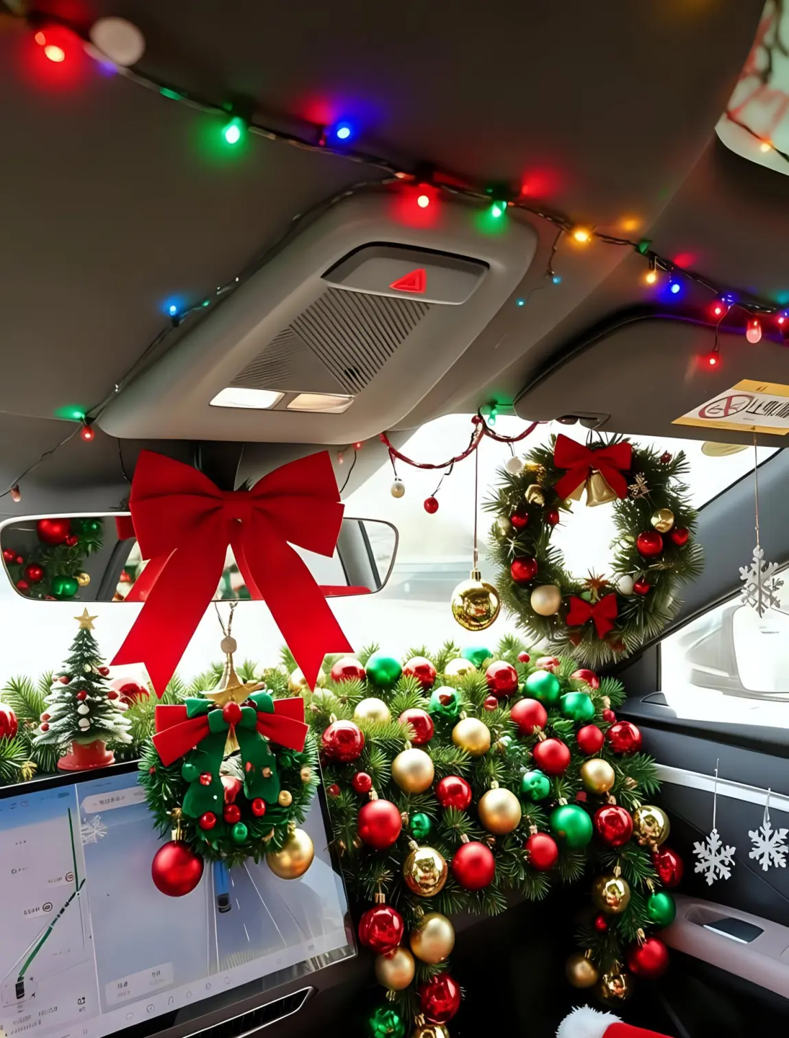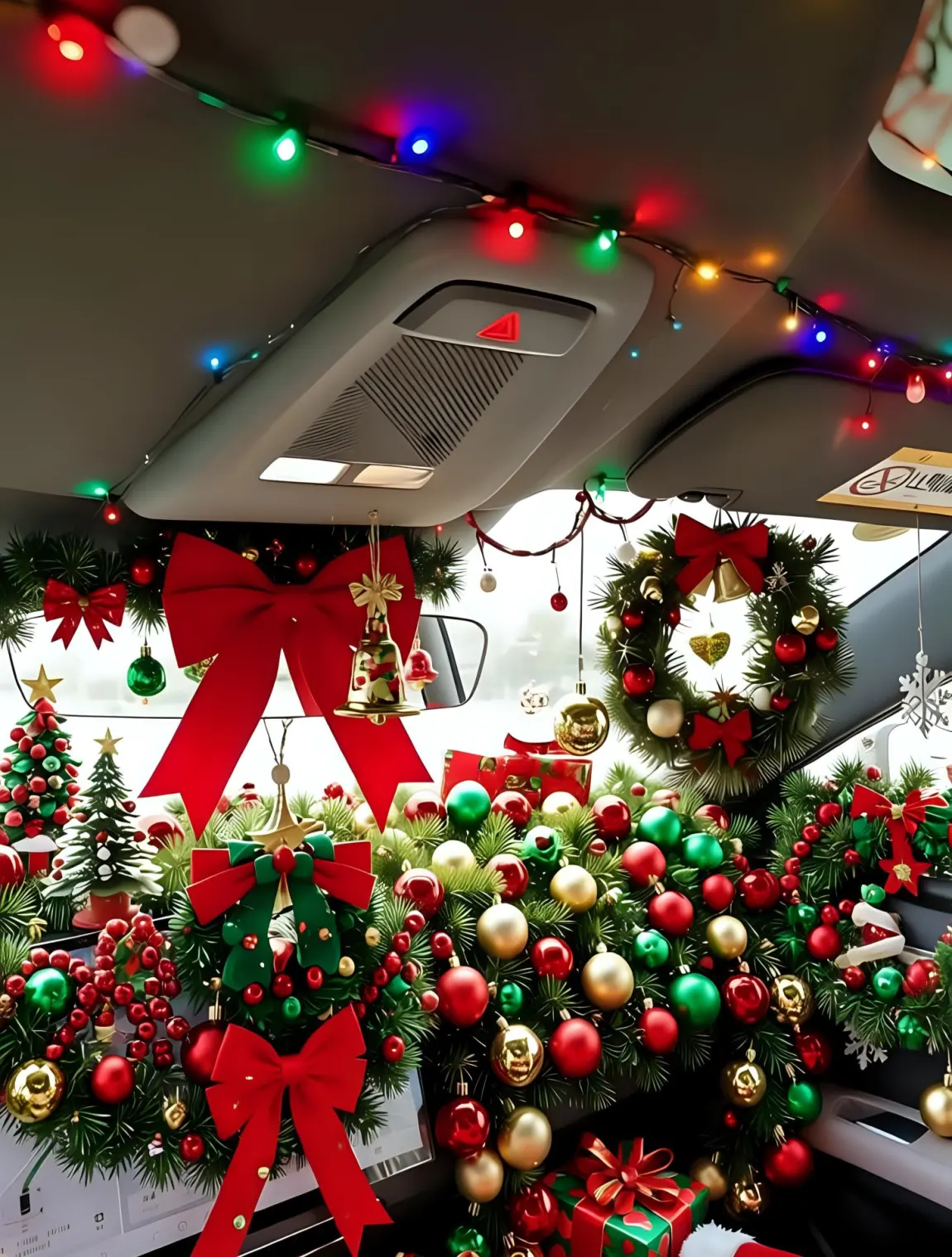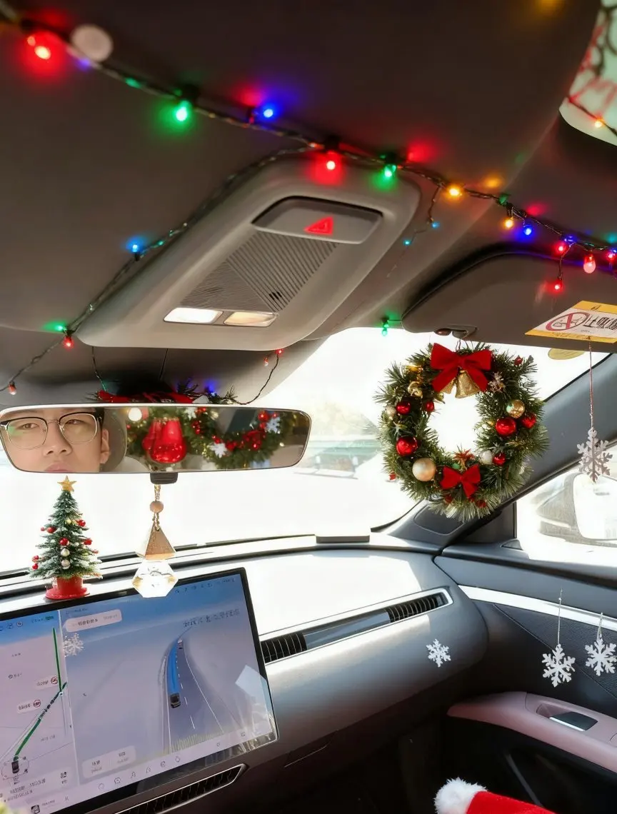 #我的圣诞魔力座驾# mona03的车顶悬挂着彩色的圣诞串灯,红、绿、蓝、黄等色彩,中控台大量圣诞元素铺满,有翠绿的圣诞枝叶,搭配红、金、绿三色的圣诞球,还有多个带红色蝴蝶结的圣诞花环、金色铃铛、小型圣诞树模型,以及包装精美的圣诞礼物盒;后视镜、车窗等位置还点缀了雪花挂饰、星星挂饰,绝!