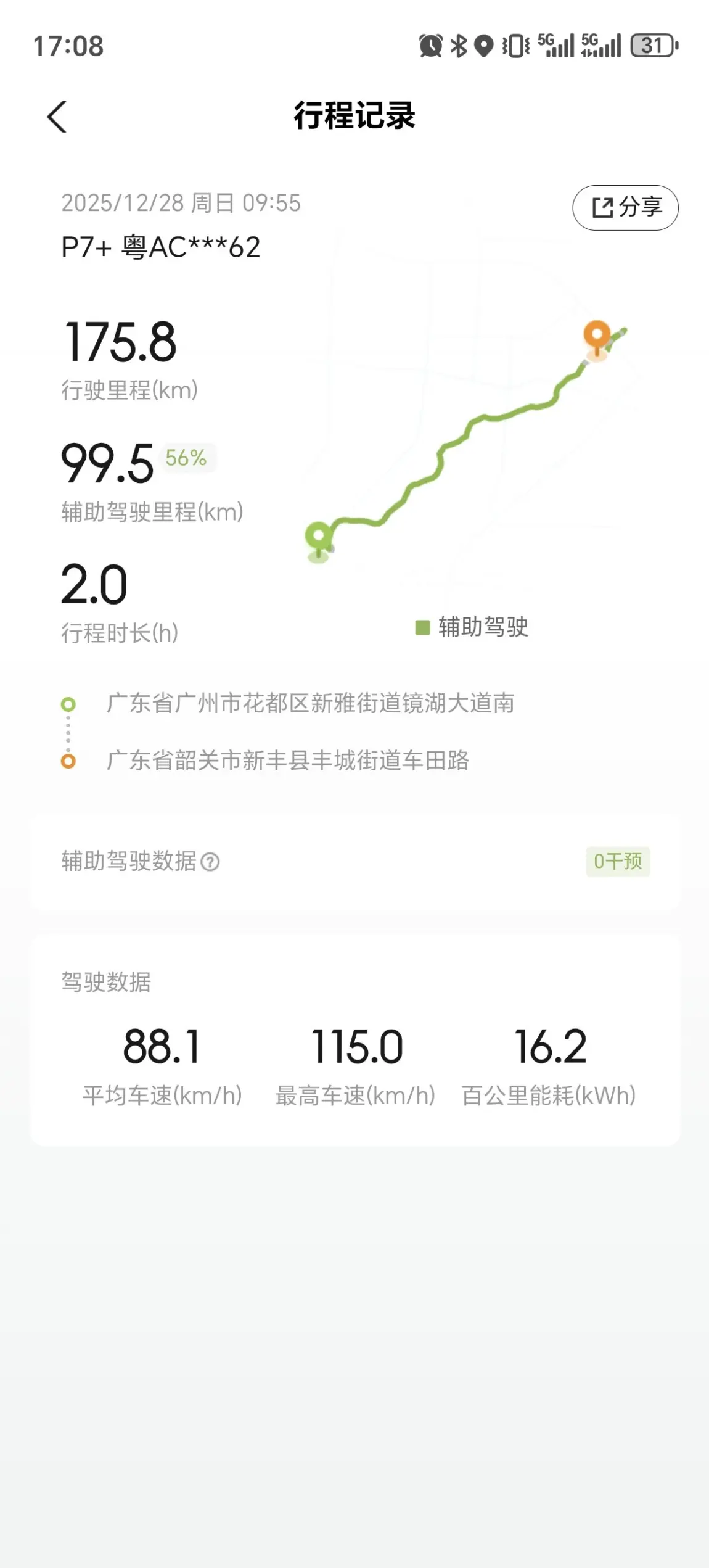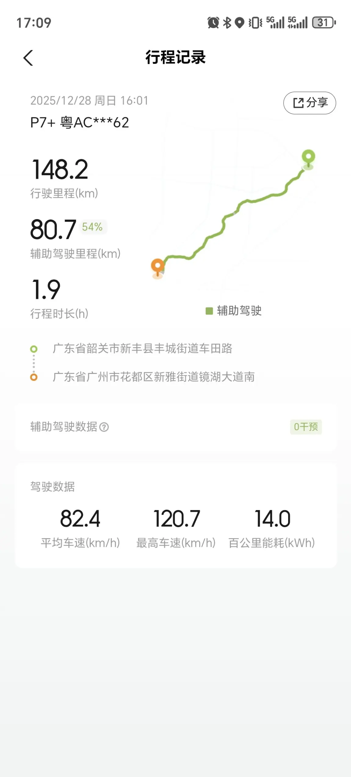 【行程情况】12月28日,趁着周末休息,把车洗干净,孩子不上学,家人有空,20多度的晴天天气又舒服,带上家人一起广州前往韶关新丰县去溜达一圈。小舅子的新房子刚装修好了,超市买了点加用的东西前去布置一番。当天往返,平时我自己开车能耗11-12个左右,正好也试下p7+在高速长途中的真实能耗表现。