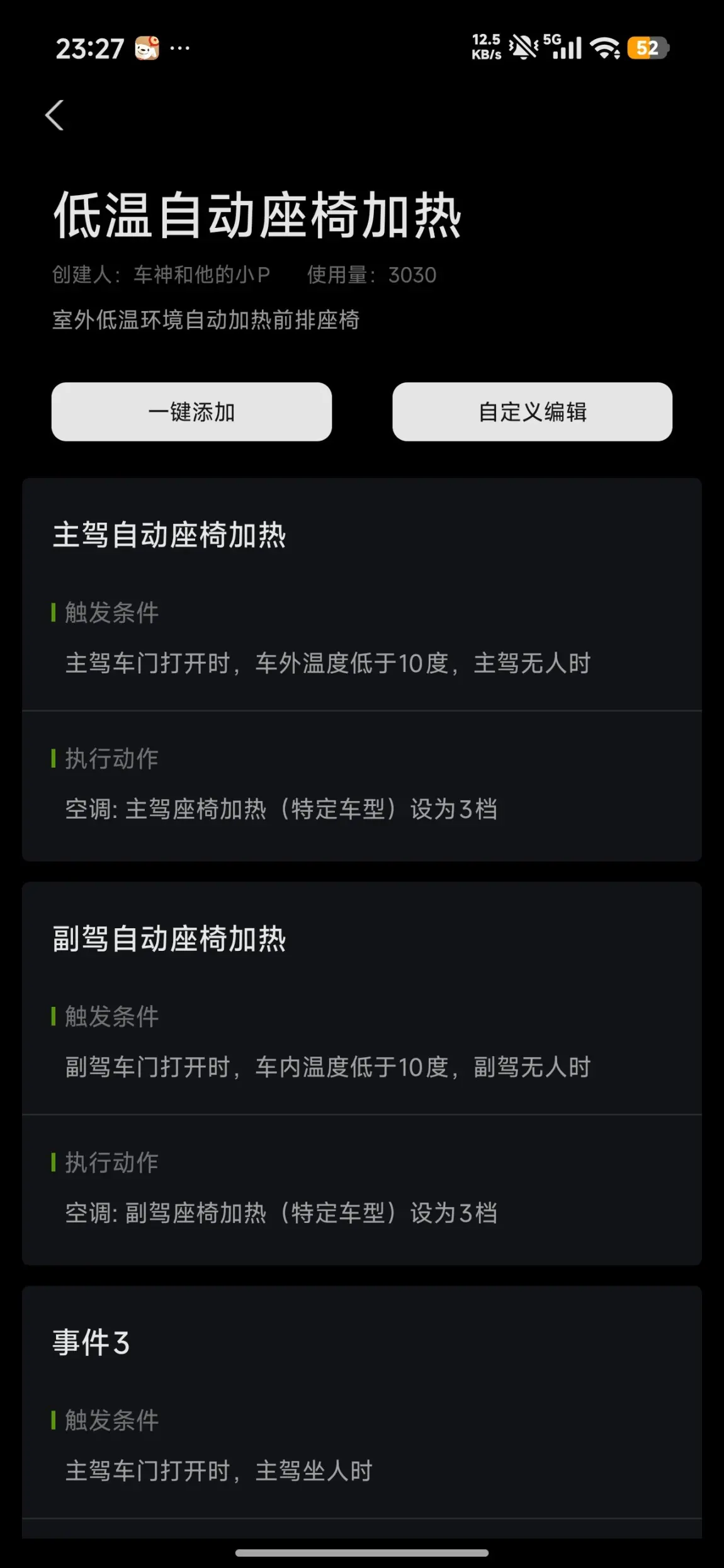 冬天到了,温度下降,为了出行舒适,可以使用快捷指令,设置快捷打开座椅加热和方向盘加热。当然,我们也可以提前手机上打开热空调,充电时电池预热也要打开,提前电池升温,有效提升续航。