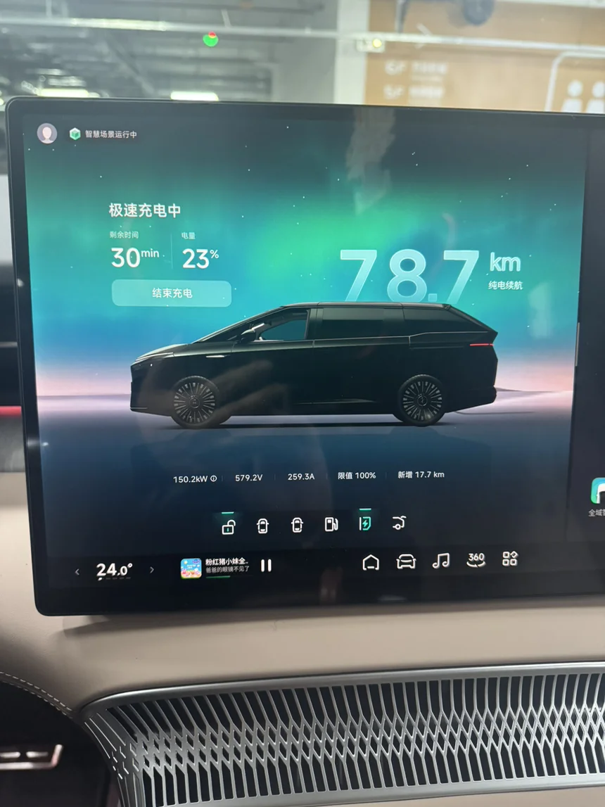 提车一周给家里宝宝看动画片瞬间安静,宝宝一直和小P互动,小P也是厉害很多我自己听不懂,小P居然能执行指令突然惊讶到我!氛围灯真的高级看着心情愉悦,增加了场景模式随车速还会渐变高级的很!体验了下小鹏液冷超充速度真的快,非常便捷而且X9辅助驾驶到充电站门口才让我接手,自动泊车非常精准正好边上有变压器停的和老司机有的一比,充电散热没有噪音费用也不贵还能充到100满电20分钟补能当纯电车完全能胜任!驾驶感受,整体调教的舒适,也没有轮船模式,空气避震选择运动路感很细腻支撑力足够,侧倾抑制做的非常好,给工程师点赞!整体使用感受加上这个价格满分10分,我给9分,超级增程没有续航担忧!