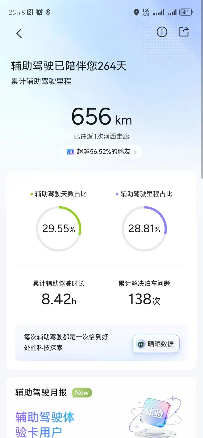 小鹏NGP陪我走过264天啦,累计辅助驾驶里程656km,还超越了56.52%的鹏友,成就感拉满!😜 这大半年里,辅助驾驶天数占比近30%,累计帮我解决了138次泊车难题,8.42小时的辅助驾驶时长里,不管是高速巡航还是城区泊车,NGP的识别和反应都特别稳。