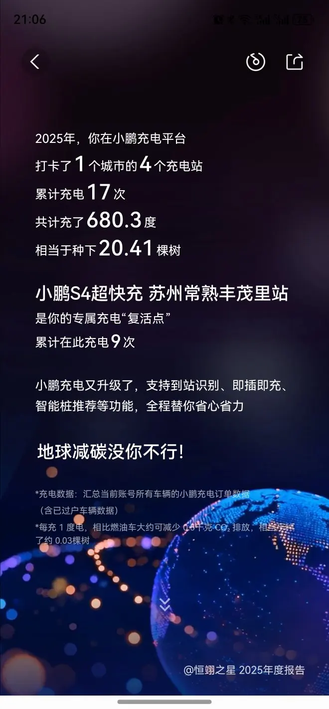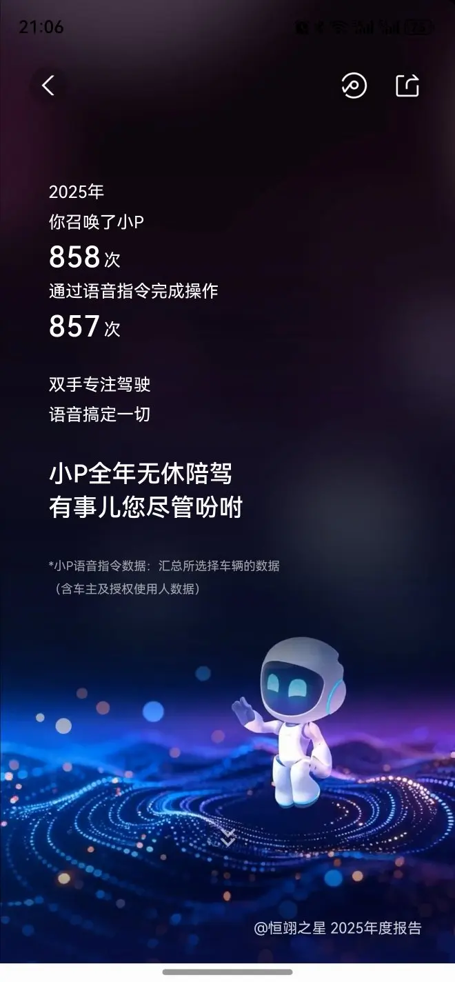 2025年即将过去,全年累计开着小P行驶了超15000公里,累计充电3011度,现在与小鹏P7相伴已满1500天。2026年,新的开始,新的出发,与小鹏一起继续前行!