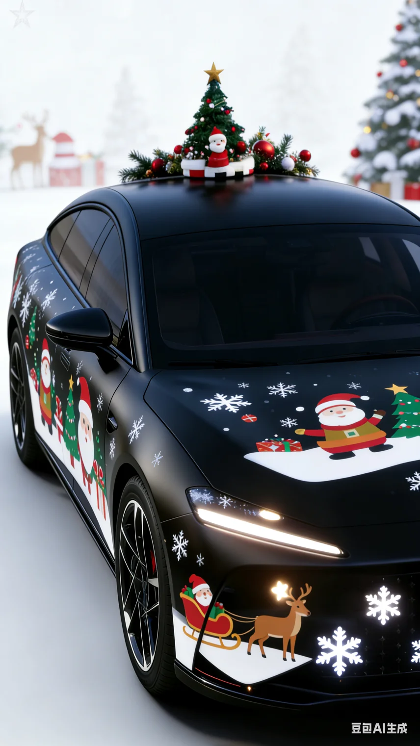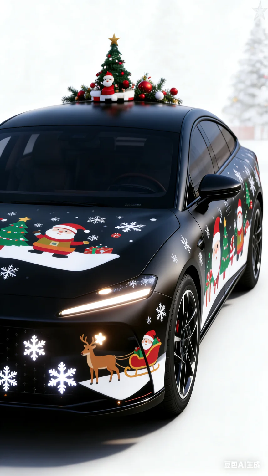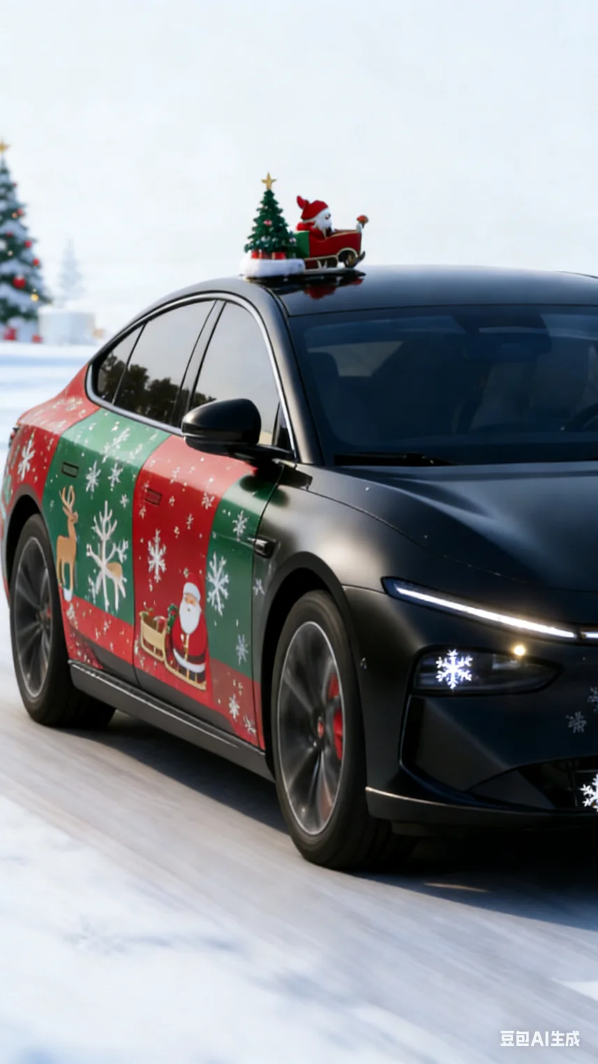2. 保留原车本色质感,圣诞装饰巧思满格:侧身麋鹿雪橇+圣诞老人元素丰富吸睛,前脸雪花灯效点亮仪式感,车顶缀圣诞装扮添趣,全景呈现整车圣诞格调,颜值与氛围感双在线!