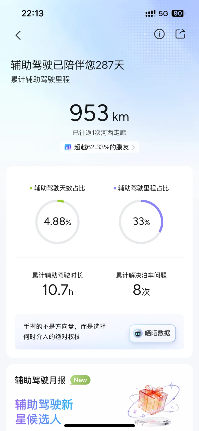提车快8个月了,今年8月从重庆出发,直达宁夏中卫,全程约1150公里,中间充电3次,用车体验很好,没有想象的续航折扣那么大,高速使用ACC及LCC,轻松很多。