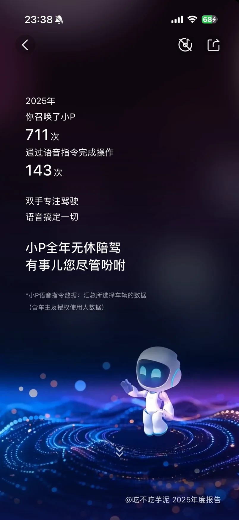 #小鹏汽车、#小鹏MONA、#2025小鹏智能用车报告、#年度关键帧、#年度报告2025年和小鹏相伴42天,跑了602公里、解锁83段旅程,从里程报告截图里能看到最长一趟56公里的出行,都被智能体验包裹。另一张语音报告更让我惊喜,全年召唤小P711次,143次语音指令实现“动口不动手”,驾驶专注度拉满,补能成本远低于油车。虽相处时间不长,但小鹏的智能车机和便捷补能,让我真切体会到智能出行的魅力,也让每段短途都变得轻松又有趣。