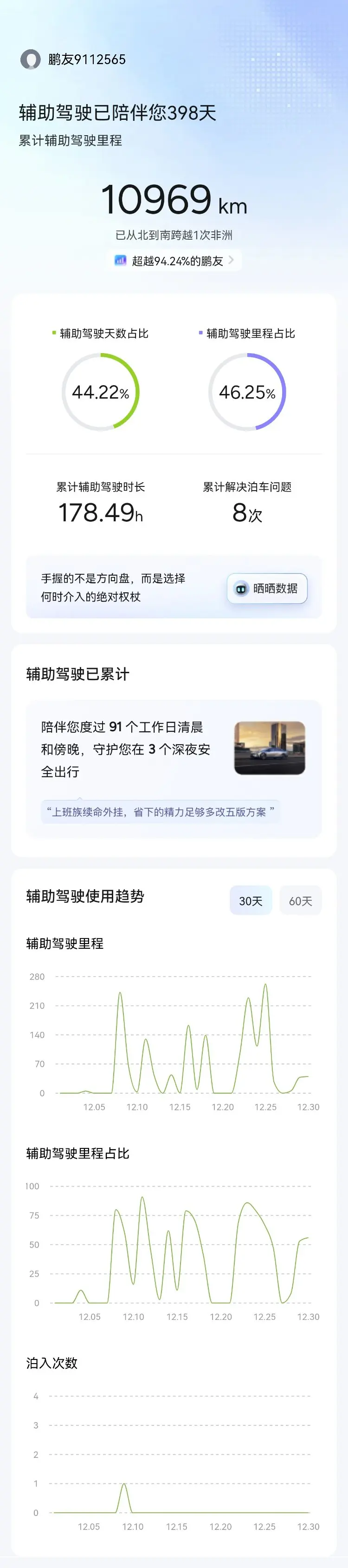 小鹏汽车使用一年有余。出门堵车,高速必智驾。自驾还是给我们长途旅行带来了很多的方便,也缓解了我们很多的疲劳,希望小鹏智驾越来越好,确实它的每一次更新,每一次的改进都让人惊喜。它的全系标配NGP,还是很贴心的。给小鹏点赞。以后换车还是换小鹏!