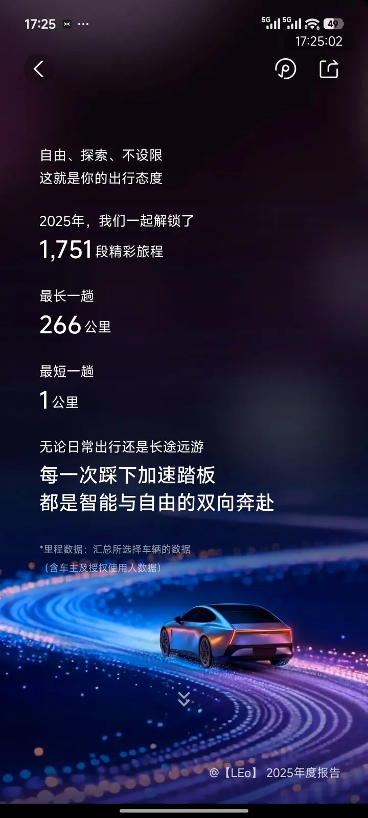 1. 行驶里程:2025年累计行驶27497公里,完成1751段旅程,最长单次行程266公里,最短仅1公里,无论是短途代步还是长途出游都能轻松应对。