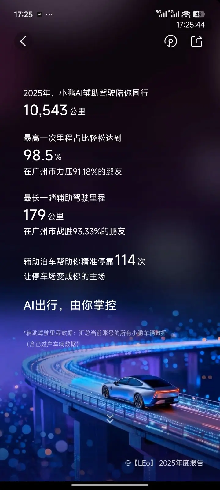 2. 智驾表现:AI辅助驾驶里程达10543公里,超越96.45%的鹏友,单次行程智驾里程占比最高达98.5%;最长一趟辅助驾驶里程179公里,辅助泊车精准停靠114次,智驾系统已经成为出行中不可或缺的“好帮手”。