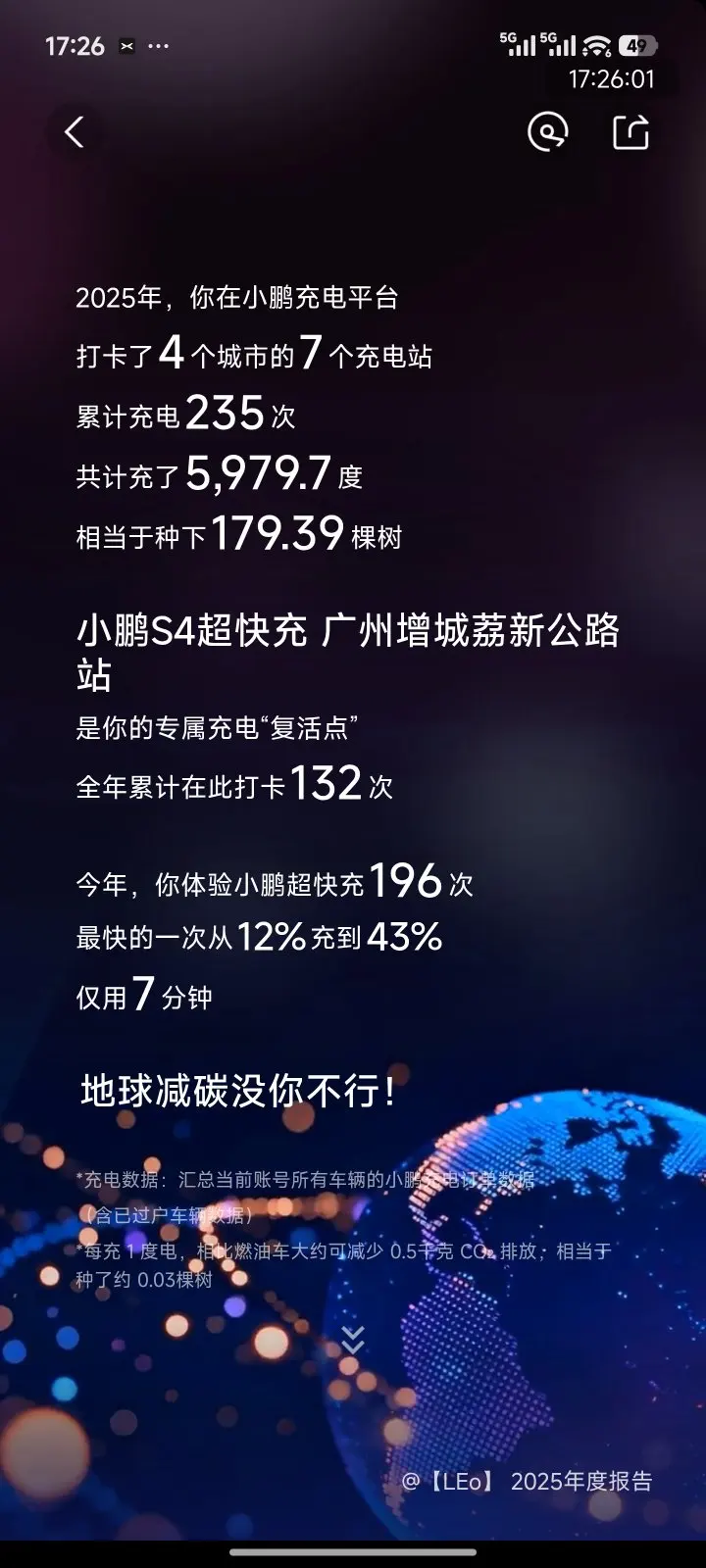 3. 跨城与补能:全年解锁10个目的地城市,在小鹏充电平台打卡4个城市的7个充电站,累计充电235次,其中体验小鹏超快充196次,最快一次从12%充到43%仅用7分钟,广州增城荔新公路S4超快充站更是我的专属“复活点”,全年打卡132次。