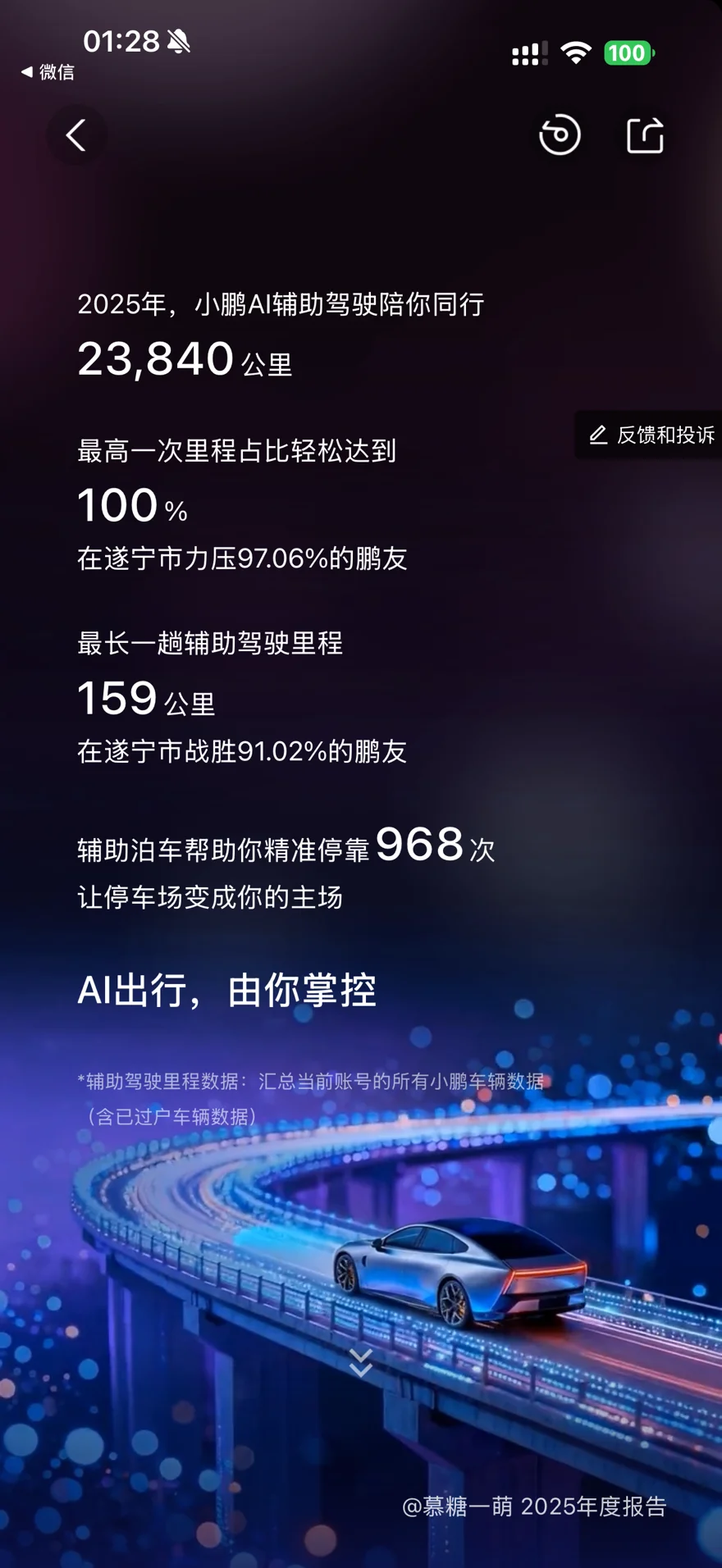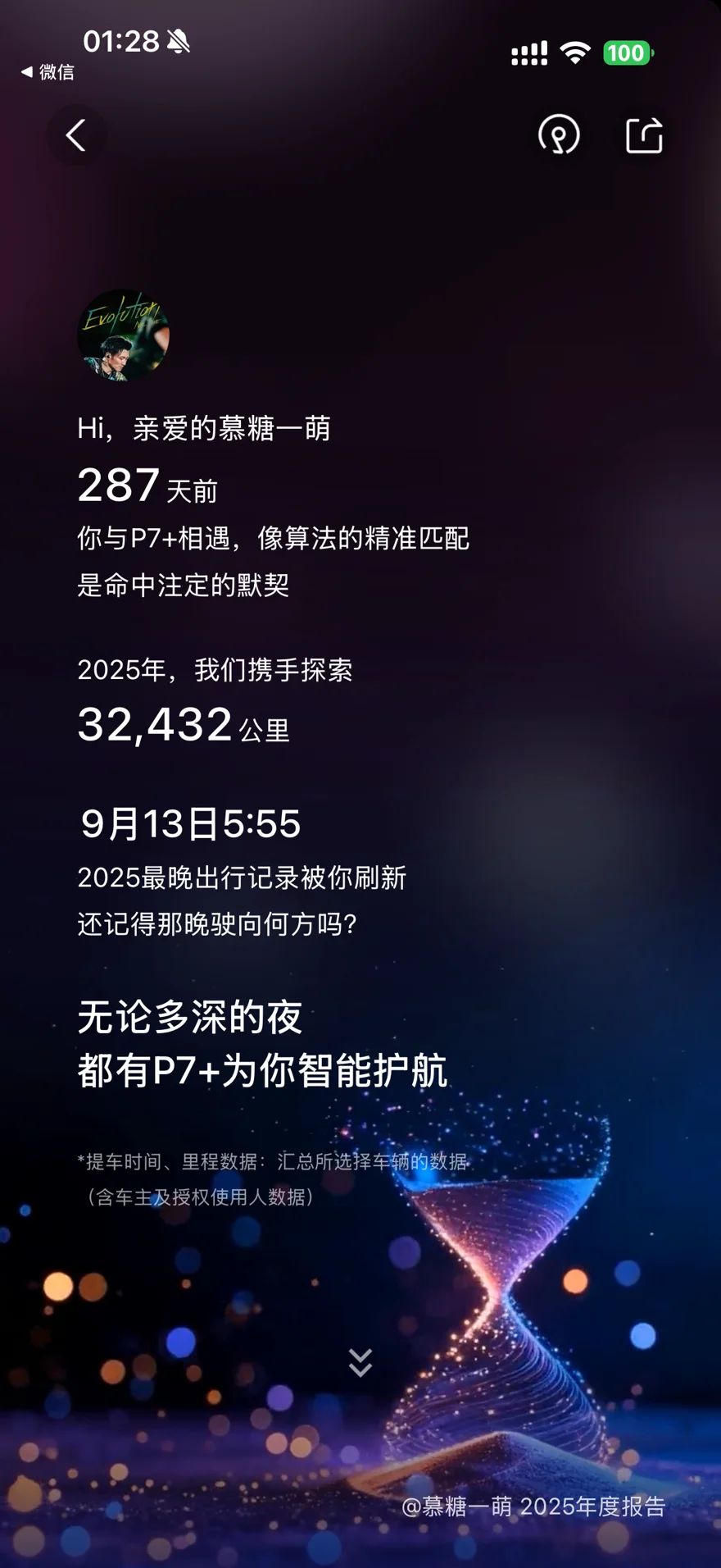 2025年终究过去,与我的p7加还不到一年时间,行驶了三万多公里,走过了26个城市,以前没有电车的时候,无论远近都是乘坐高铁或者飞机,自从有了p7加后,大大的改变了我的出行方式,无论去哪里,首先考虑的就是开车需要多久,因为太喜欢ngp了,大大减缓了驾驶员的疲劳,且开着自己的车自驾,也能欣赏一路的风景,哪里的风景美丽,就在那里停留长一点的时间,给我们一家人的旅行生活增加了极大的便利,新的一年,希望自己能加把劲努力挣钱,争取再增购一辆X9,太喜欢这个mpv 了,不管是巡航、颜值、空间都在我的审美点上,也希望我的家人们在新的一年身体健康快乐,最后争取新的一年带着我的p7加,再在地图上填满新的10个城市,祝大家新年快乐