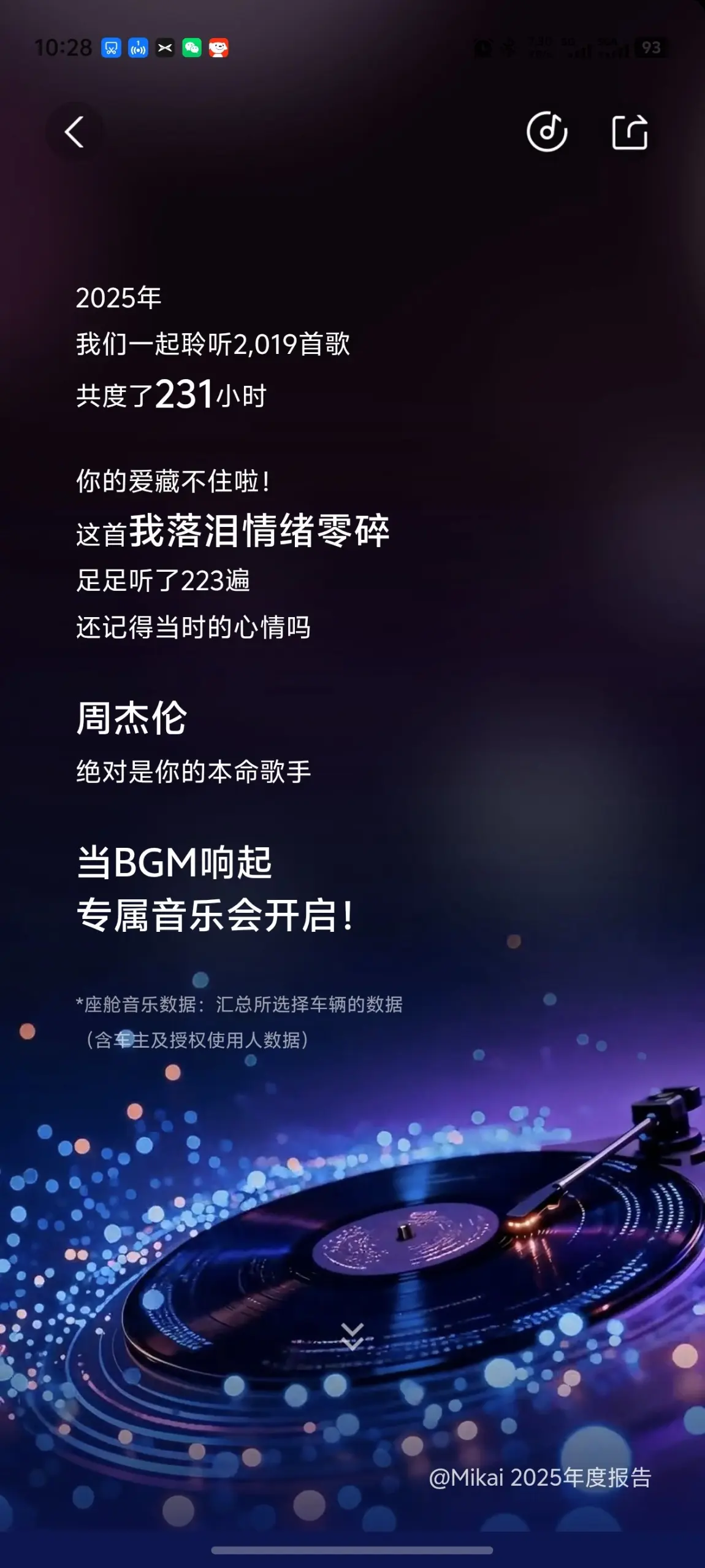 · 听了2019首歌,周杰伦的《我落泪情绪零碎》循环223遍,座舱是我的私人音乐厅。