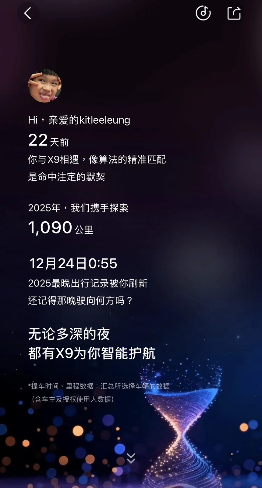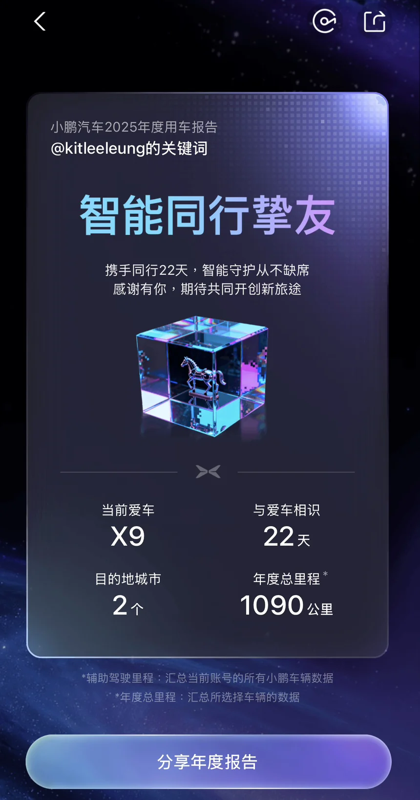 提车22 天,真正驾驶了7 天,走了 1000 公里,主要行程就是带着一家六口从深圳一路到江门再到珠海,轻轻松松游刃有余。小鹏 X9 增程版的驾驶感良好,车内空间宽敞,隔音出色。在车侧两旁贴上女儿最爱的拉花贴纸😘X9 完美变成了宝宝巴士,叫一声小 P,就轻松处理好播放音乐和电影的需求,不用烦心女儿在后排的叫嚷。有智能泊车的帮忙,大车泊车也不再苦恼,智能驾驶在高速上减低了疲劳和增加了安全性,后视镜亦贴心的有橙色灯提示后车接近,各种智慧场景超实用,例如设定好 低速或者转弯 360 影像就不再怕拐弯的盲点。希望 X9 能陪伴我们一家继续前行几年,愿下一代的 X9 能继续进步和完善用户的需求。#小鹏汽车、#小鹏X9、#2025小鹏智能用车报告#2025小红书年度报告、#年度关键帧、#年度报告、#年度总结、#年度听歌报告、#自驾游、#用车体验