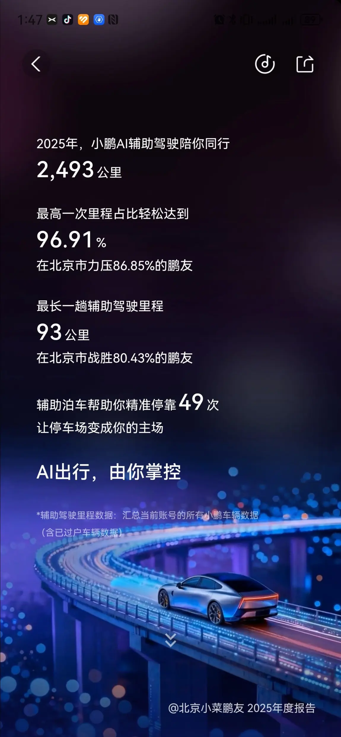 #小鹏汽车#小鹏G9#2025小鹏智能用车报告今天是与G9相遇的整整200天,带我走过了六千多公里,虽然走过的地方不多,里程不远,但是回顾2025,G9已经融入我的生活方方面面。首次让我体验长途自驾的快乐和意义,也让周末的出行变得轻而易举,更是工作日通勤的最佳伙伴。NGP更是让我在驾驶中轻松不少,主动安全系统更在关键时刻提供了安心保障。告别2025,迎接2026,期待和我的G9创造更多的故事,领域更多的人生风景!