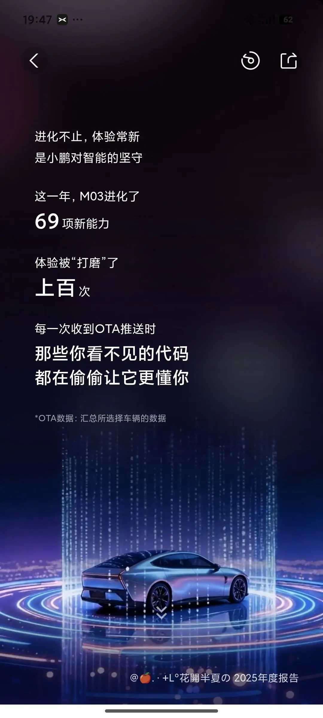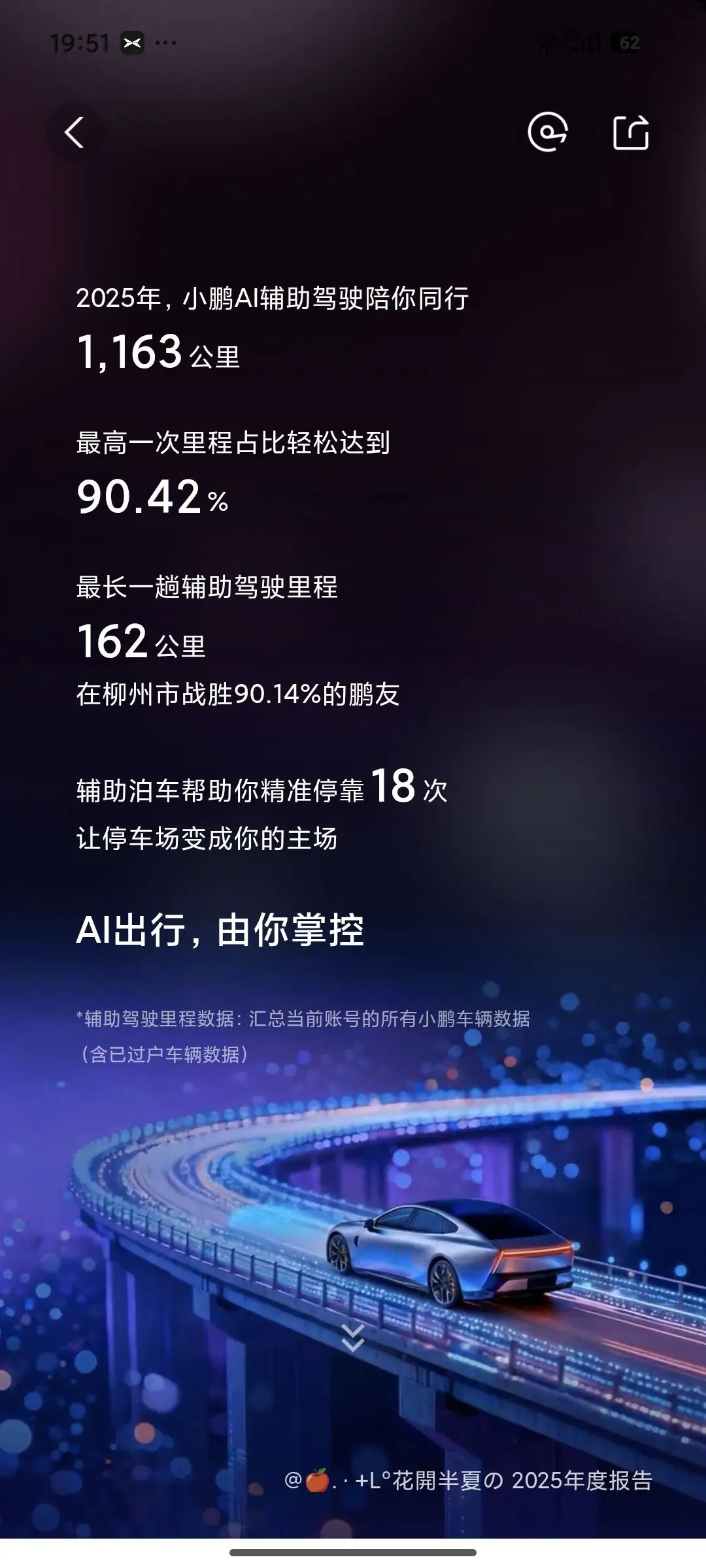 小鹏MONA 03年度用车报告 过去一年,小鹏MONA 03陪伴我安全行驶5407公里,成为日常通勤与自驾出行的可靠伙伴。600km超长续航表现扎实,综合续航达成率超80%,城市通勤一周一充毫无压力,快充更是解决长途补能焦虑。 智能座舱流畅丝滑,AI小P语音助手响应迅速,四音区交互与XNGP辅助驾驶大幅降低驾驶疲劳。座椅通风/加热功能四季舒适,5.3m最小转弯半径让城市泊车灵活自如。 全年综合电耗11.8kWh/百公里,用车成本经济实惠。整体而言,这款智能与实用兼具的纯电轿跑,完美契合出行需求。