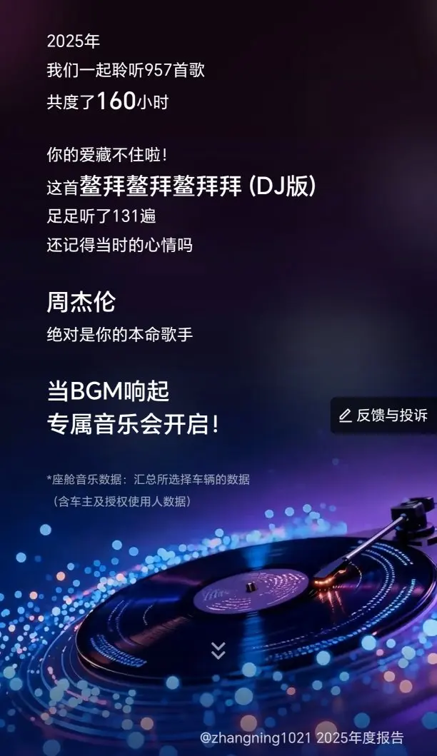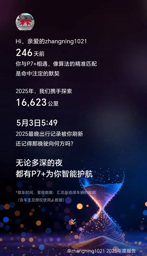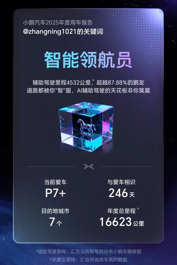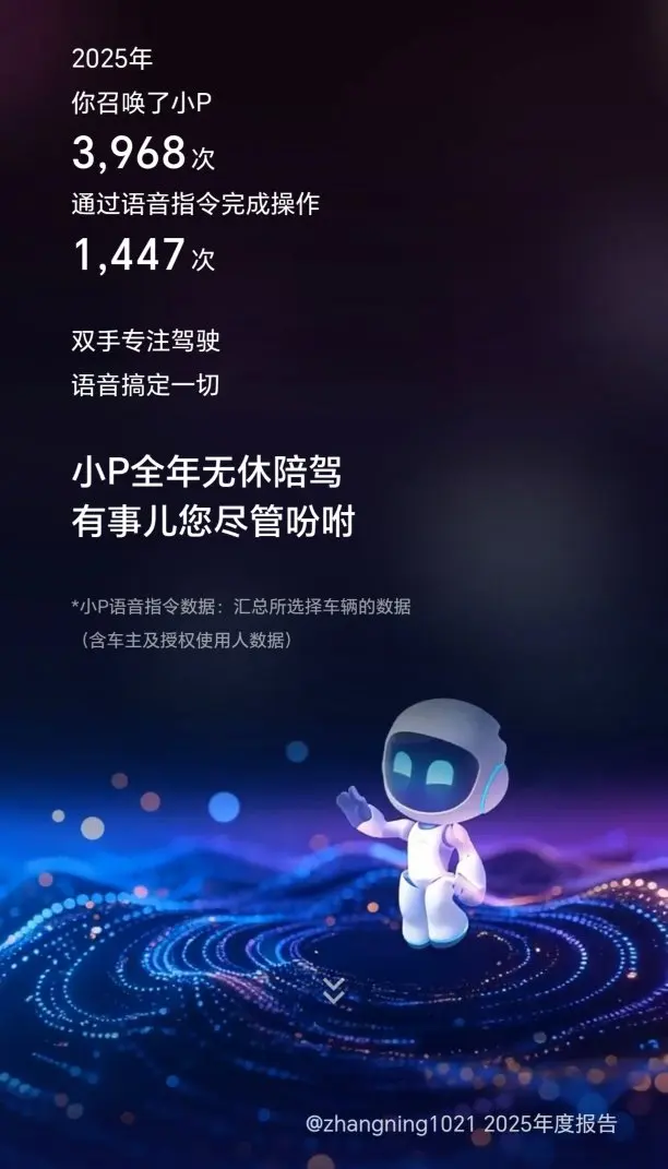 感谢小鹏P7+2025年的陪伴,看了一下年度用车报告我都震惊啦,提车8个月,总计呼叫小P3968次,完成语音指令1447次,比喊自己老婆的次数还多,哈哈,这小P的作用比自己老婆都重要了呀!平时高速跑的比较多一些,一首DJ《鳌拜鳌拜奥拜拜》听了131次,哈哈,给自己点赞!平时工作多一些,时不时的需要发微信语音、给客户回信息,所以NGP智驾对我来说就变得尤其重要呀!非常感谢小鹏这个品牌!值得信赖!