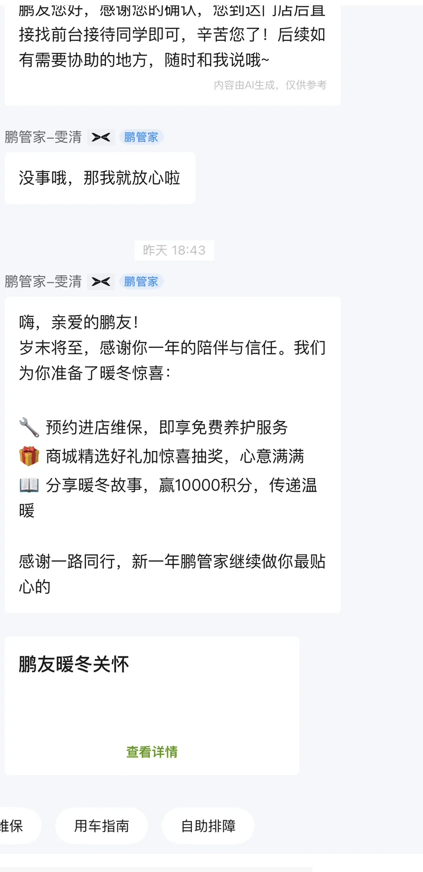 #小鹏汽车 #小鹏智能服务#小鹏暖冬关怀每次去小鹏店里面都会被提供满满的情绪价值。首先,服务态度非常好,在你去之前就会跟你对接,告诉你来了之后怎么停车,满满的安全感。第二,业务办理完之后,会给送好多可爱的小礼物,比如说香片,还有两瓶小瓶的矿泉水。最后还会帮你洗个车,或者是充个电等。离开之后,还会有人跟你对接回访,问你的感受怎么样。总体来说,是非常满意的,被服务的感觉很好😌😌