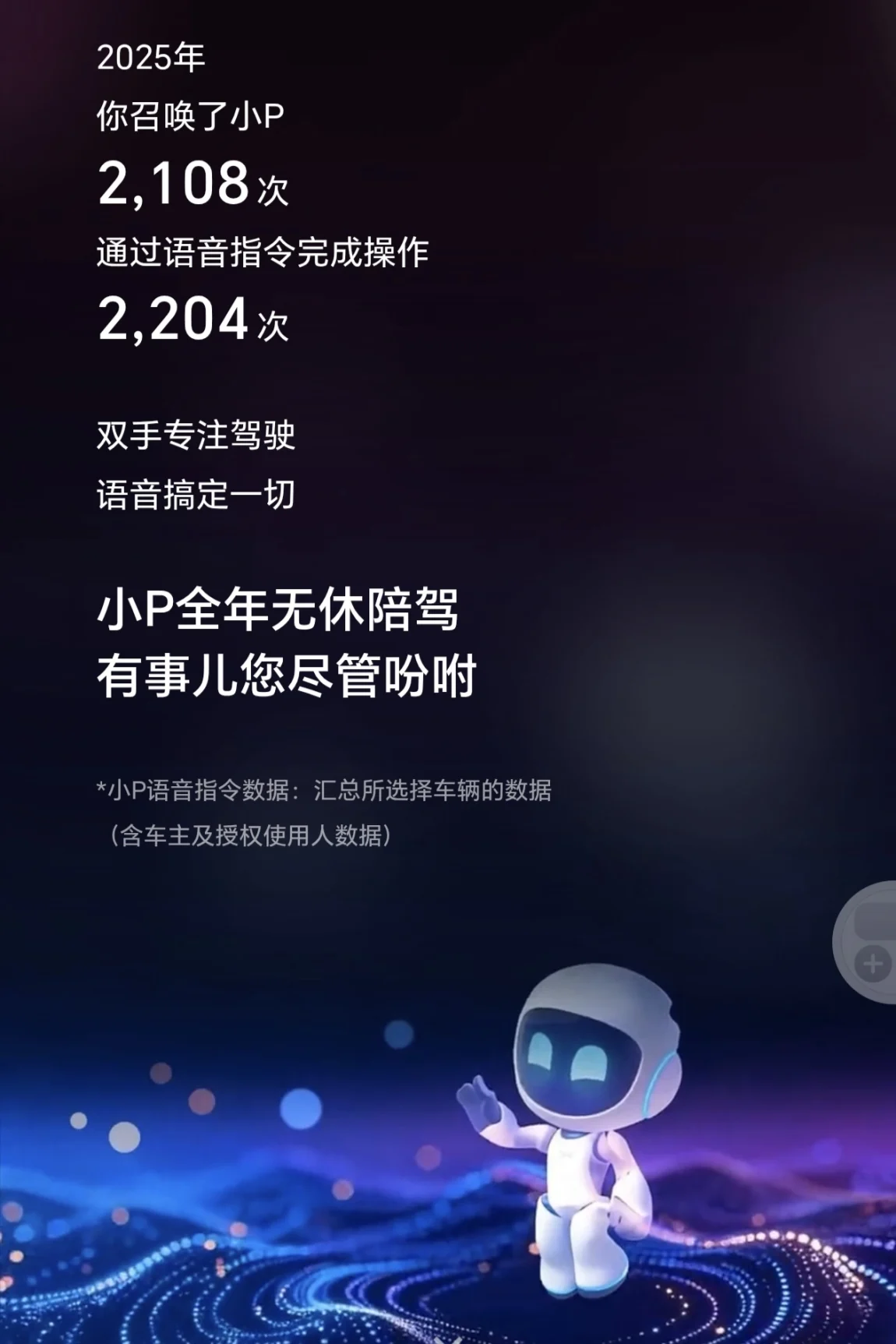 充电这块也很省心,全年24次充电覆盖了2个城市的7个站点,S4超快充18分钟从16%充到79%,补能速度完全不输加油~最惊喜的是小P语音,全年被我召唤2108次,导航、调空调全靠“动嘴”,双手不用离开方向盘的感觉太爽了!