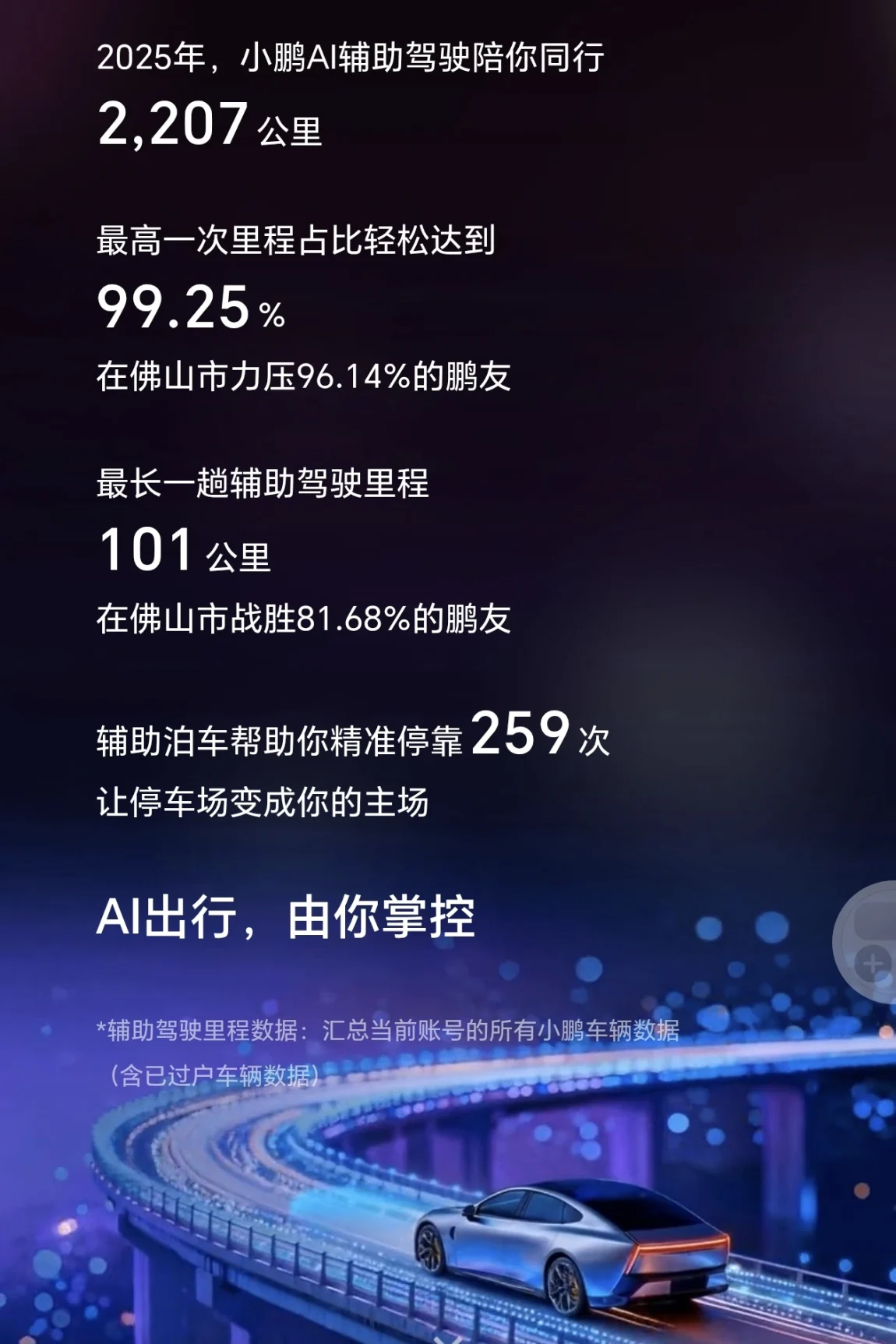今年总共跑了6136公里,829段行程里既有深夜1点的加班归途,也有167公里的短途自驾——不得不说G9的智能护航是真的稳,尤其是XNGP辅助驾驶跑了2207公里,最长一次101公里全程几乎不用接管,在佛山能超过96%的鹏友,安全感直接拉满!