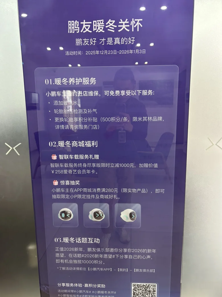 元旦保养奇遇记!来金华汽车城售后,收获满满幸福感~本来只是例行保养,没想到赶上了他们的新年暖心活动。等待的时候,工作人员主动端来礼品和热茶,节日氛围直接拉满。师傅做保养的细节真的戳到我了,保养的时候全程透明化,还会给我看换下的旧零件,讲解新零件的优势。连发动机舱都帮我清理得干干净净,比我自己洗车都仔细!结束后还送了新年定制小礼品,实用又好看。这样的服务,谁能不爱啊!已经安利给身边所有小鹏车主啦~小鹏汽车# 小鹏暖心服务#小鹏暖冬关怀