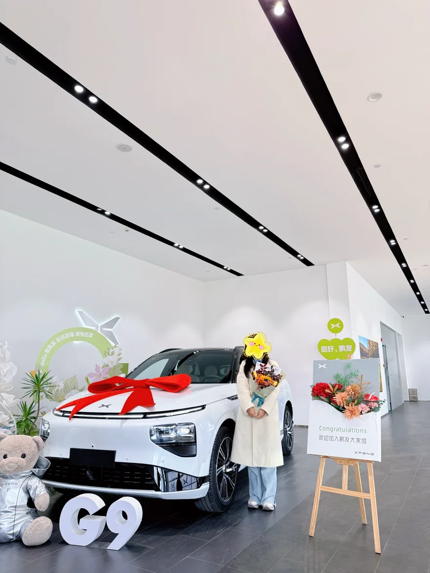 提车:1️⃣中午12点到现场,交付工作人员带我们看车,处理了一些车上的小瑕疵后,确认都没什么问题,车洗干净了电也充满了。2️⃣送了脚垫和小鹏娃娃,我的销售还特别给我买了束花。3️⃣交付工作人员态度很好,给我们讲解车辆讲解的非常仔细,之后带我们去拍照。整个用时大概1小时,我们去的那天人少,所以比较快。