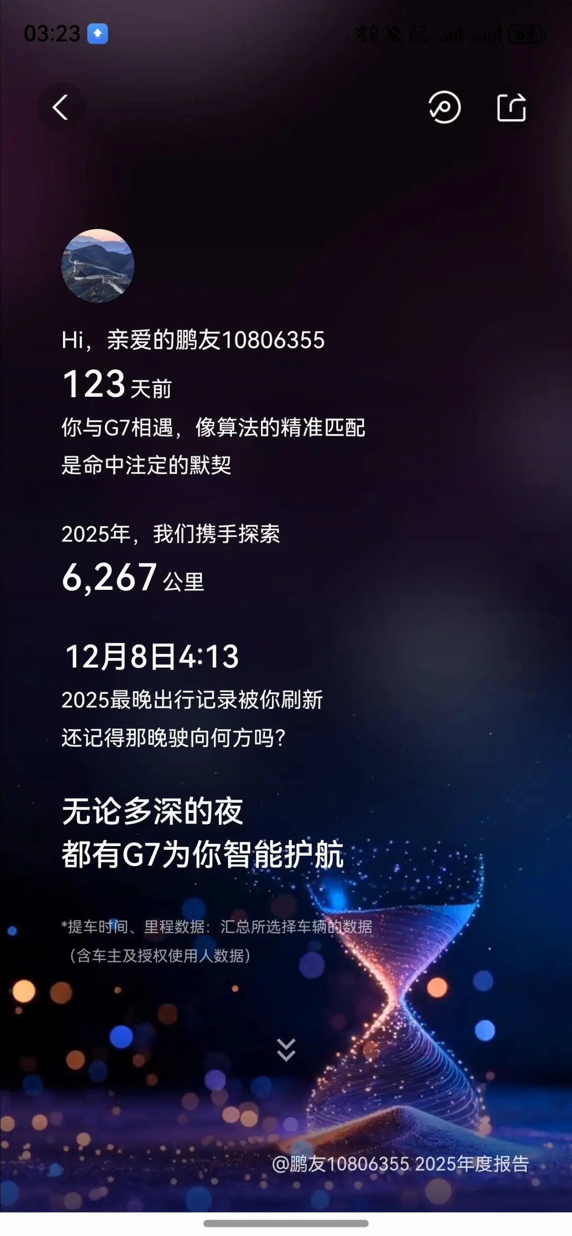 2025刚刚过去,一切都过得好快,这一年拥有了人生中的第一辆车-小鹏G7,可能是因为是小鹏的粉丝,所以买了这辆车,这辆车陪我成长了不少,但也还有一些遗憾。2026刚刚开始,希望这一年能开着车去看更多更美好的风景,也希望副驾上能坐上一个长久陪伴的人,更希望自己身体健康,万事顺意。多喜乐,长安宁。愿大家一切都好。#2026新年愿望#