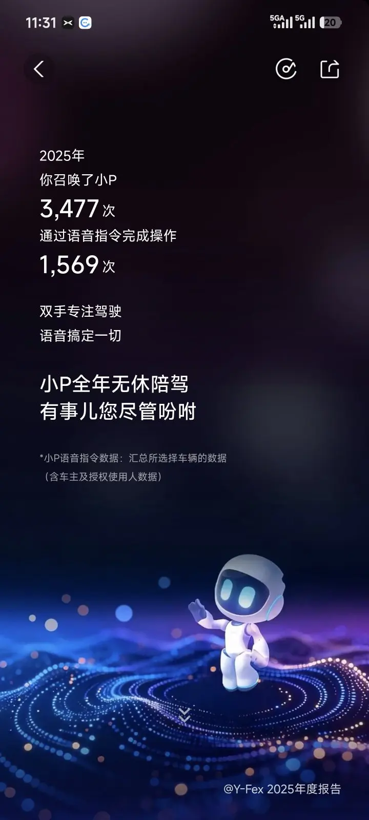 车机的小P也超给力,全年被我召唤了3477次,语音开空调、设导航、切歌都秒响应,1569次语音操作让开车全程不用分神。充电更是从没掉过链子,全年充了91次电,体验了52次超快充,最快20分钟就从14%充到77%,打卡13个城市的35个充电站,长途自驾的续航焦虑直接消失!