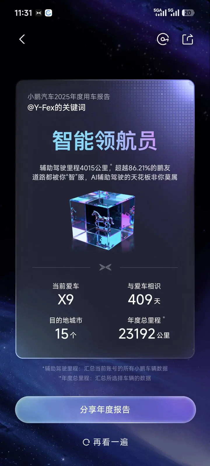和小鹏X9相识的第409天,2025年一起跑了23192公里,打卡了15个城市,这份智能用车报告里的每一个数字,都是实实在在的美好体验~
