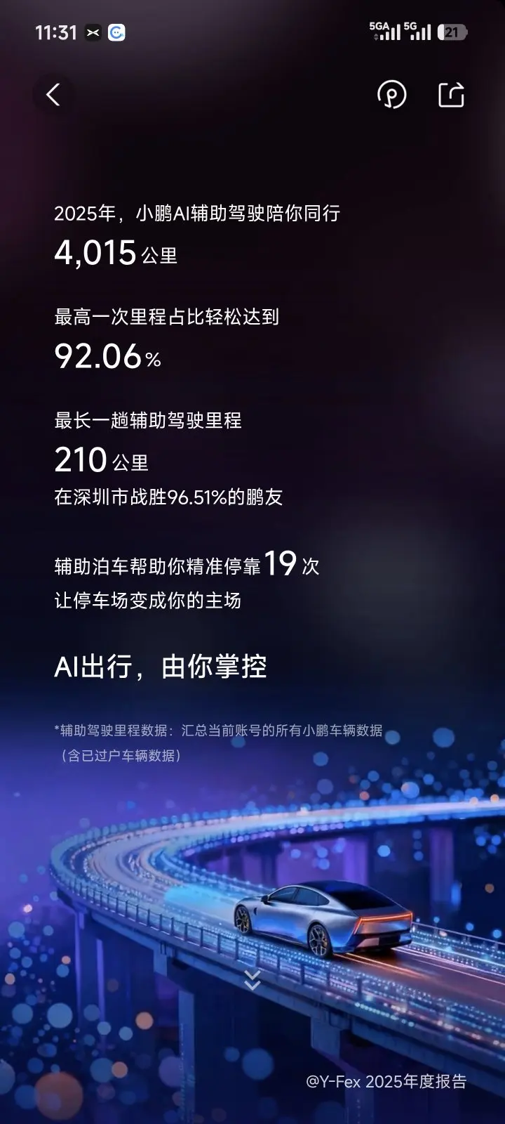 智驾真的是年度惊喜,全年辅助驾驶里程4015公里,最长一次跑了210公里,高速上基本不用手动接管,连复杂的停车场辅助泊车都帮我精准停了19次,直接超越86.21%的鹏友,妥妥的“智能领航员”!
