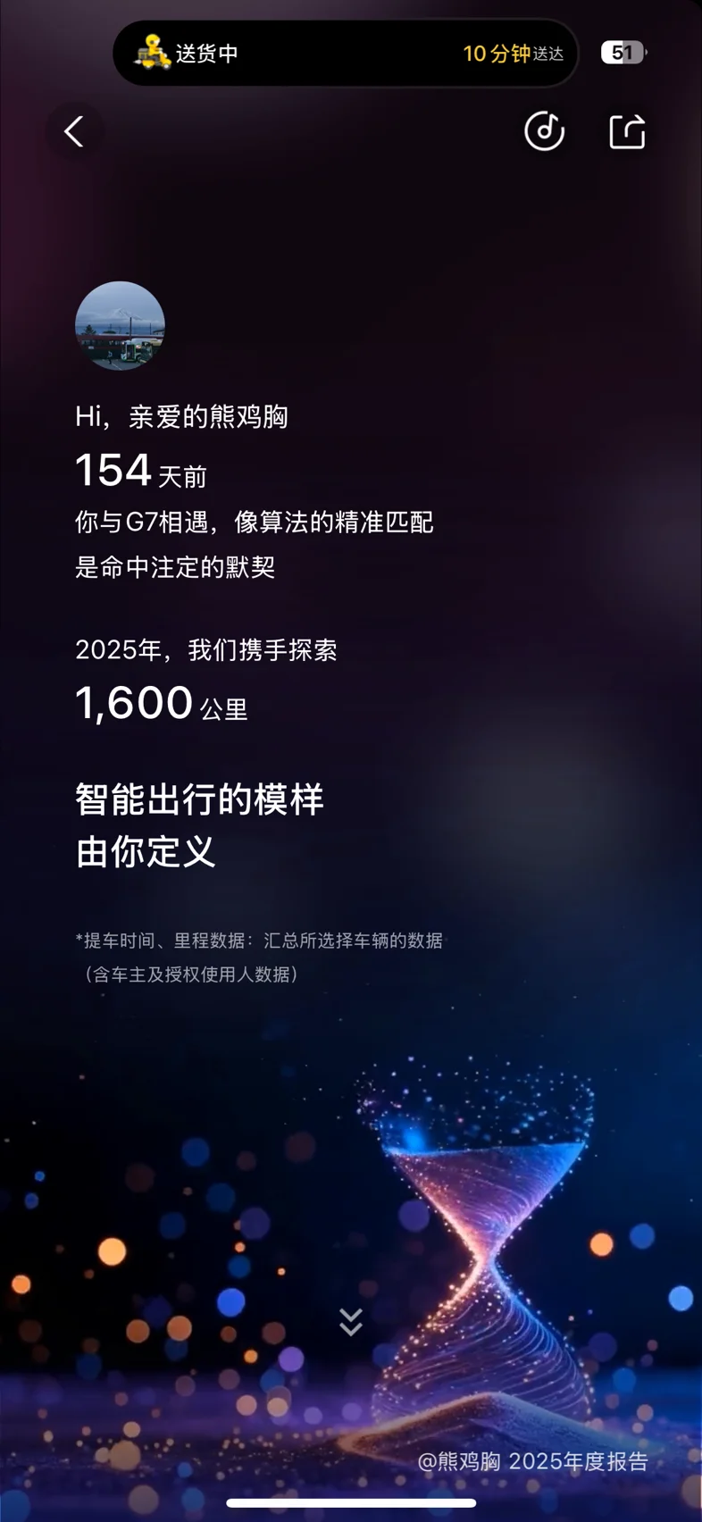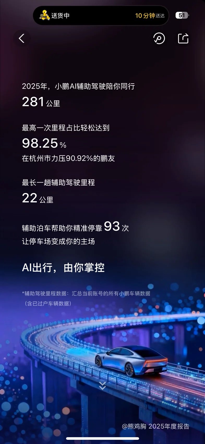 人生的第一辆车,这一年,小p和我一起跑了1600公里,印象最深的一次旅途是前几天去建德,95%的路程都是ngp,彻底解放了双手,让路途不再枯燥劳累,最爱的还是辅助泊车功能,再难停的车位小p都能帮我停进去,新手司机最害怕的停车问题迎刃而解。还记得傍晚小p带我去钱塘江边吹江风,周末带我去逛商场,逛公园,前段时间早上5点多带我去几十公里外的地点考试,小p已经成为我日常生活的好搭子,不可或缺的好伙伴,新的一年要去探索更多未知的地方!