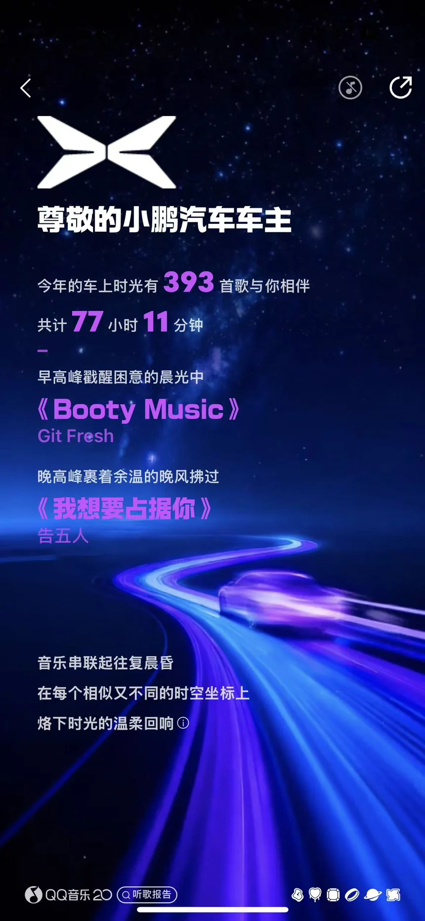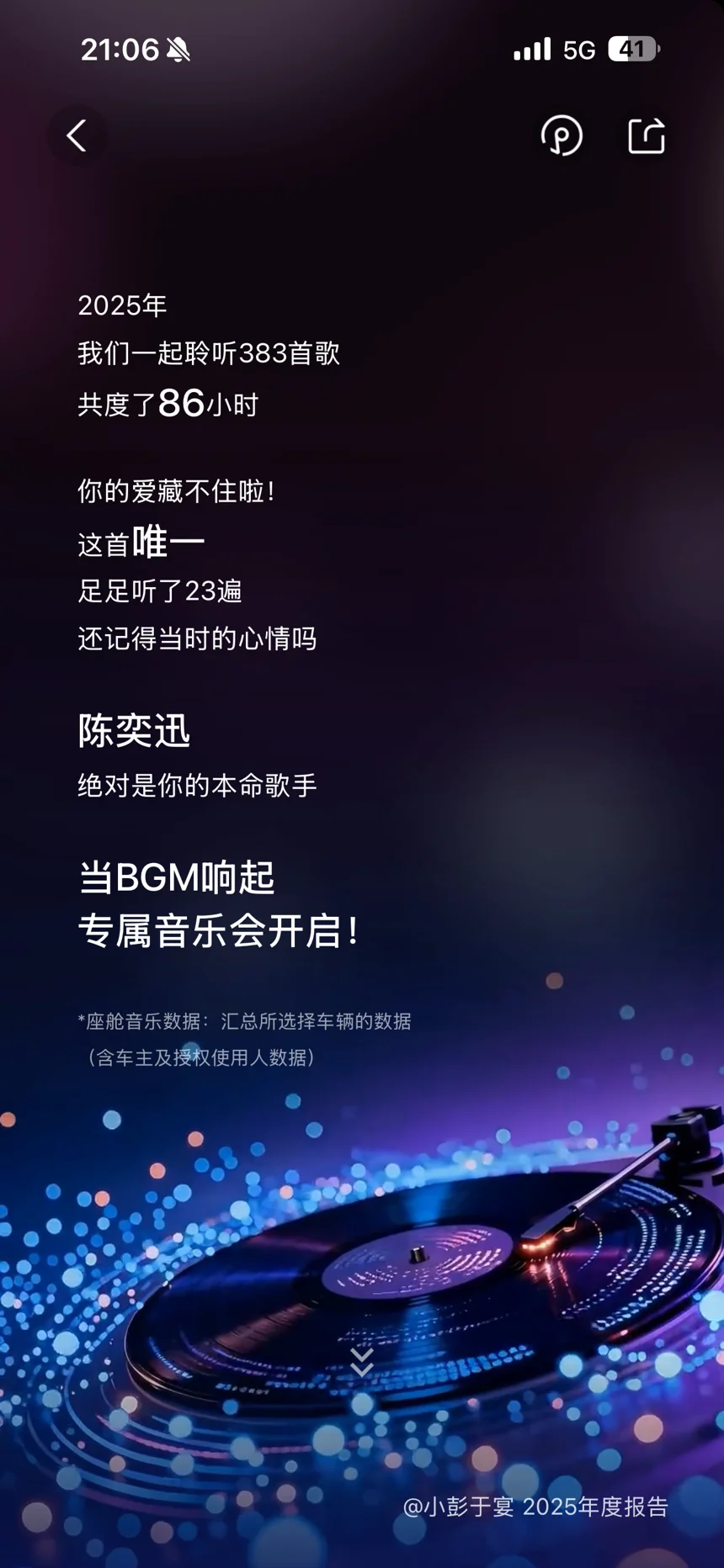 车里的音乐时光也超美好,一年听了383首歌、共度86小时,陈奕迅的歌循环了无数遍,早高峰的困意、晚高峰的烦躁,都被P7的音响系统治愈。