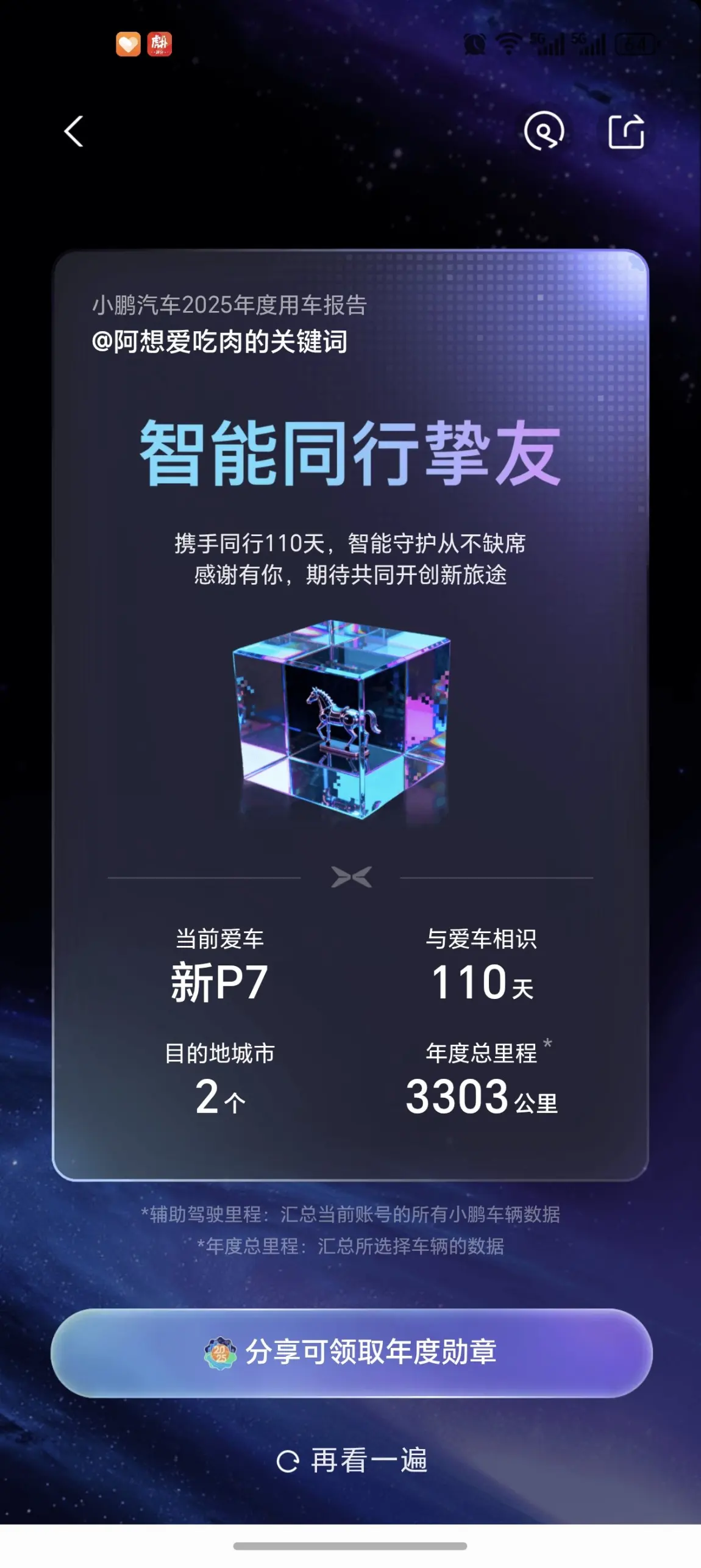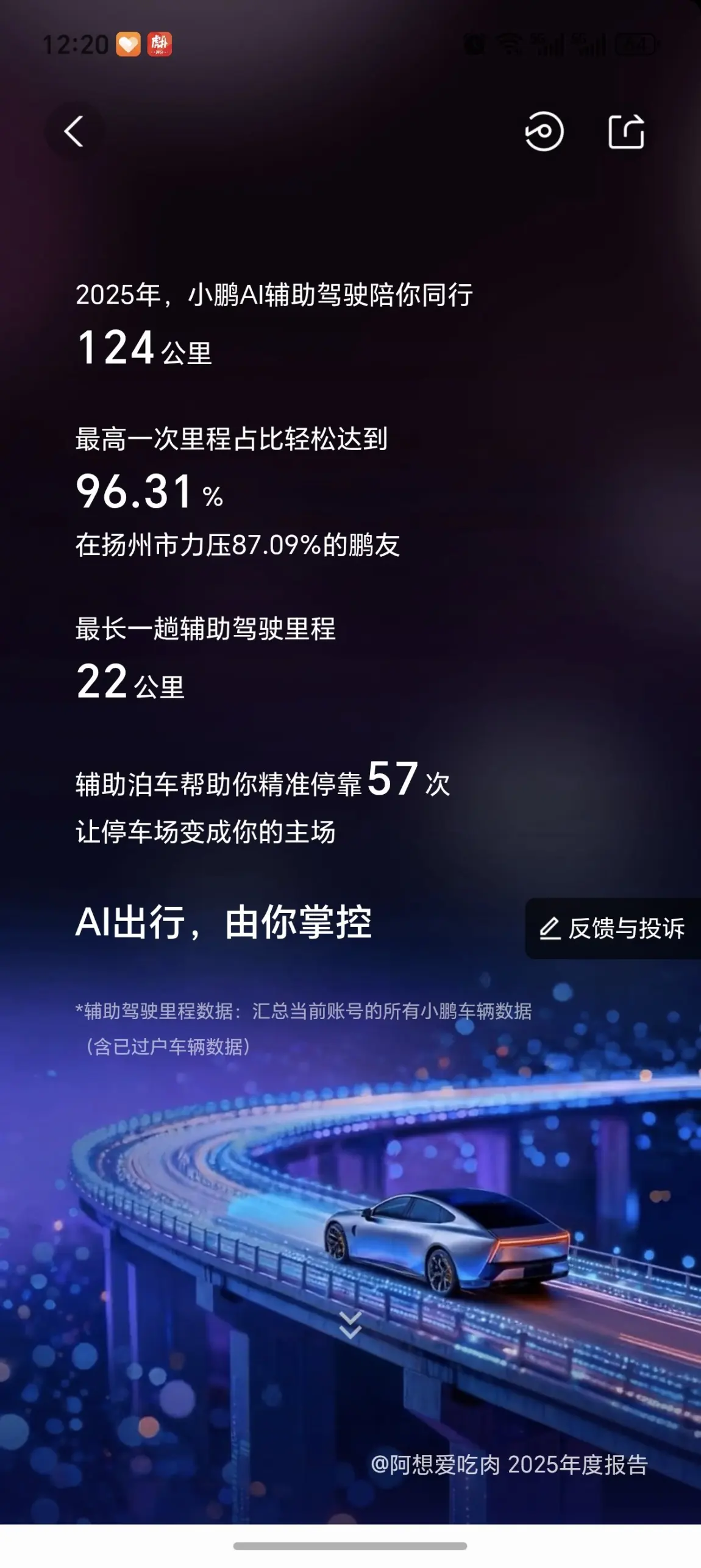 1. 提车110天,新P7陪我跑了3303公里✨ 智驾里程占比最高96.31%,57次辅助泊车专治停车焦虑,754次召唤小P,语音控车真的香!2026继续解锁更多远方🚗2. 年度出行成绩单出炉📊 新P7 110天3303公里,智驾、泊车、语音交互全在线,短途通勤+周边游的快乐谁懂!明年目标:跨城自驾,打卡更多超充站~3. 我的2025智能出行初体验✅ 新P7 3303公里旅程,智驾里程超给力,辅助泊车拯救新手,小P语音随叫随到。2026,和爱车一起奔赴更远的风景🌿